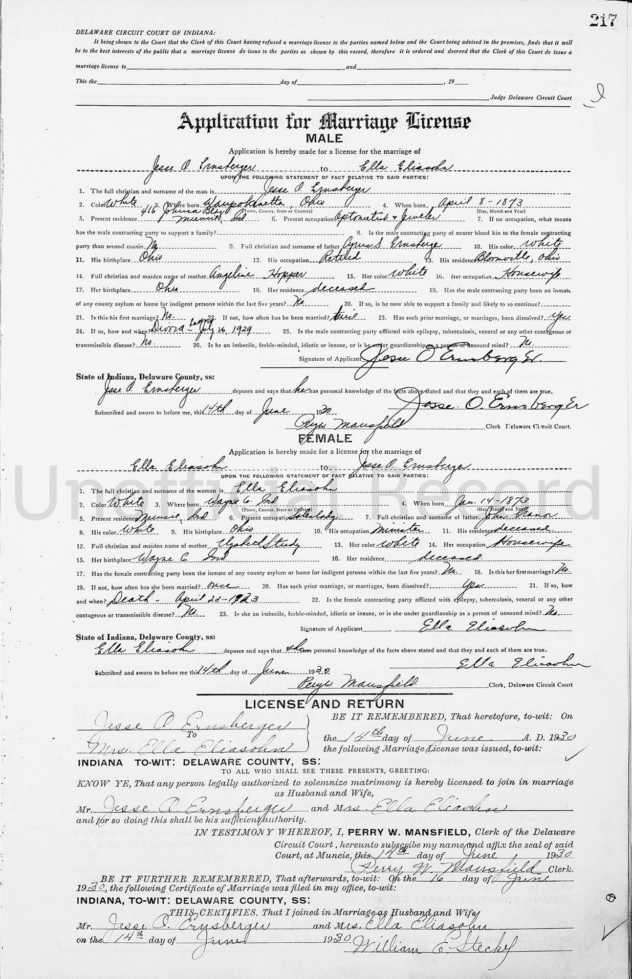 1 "Indiana Marriages, 1811-2019," database with images, FamilySearch (accessed 8 Apr 2014); Jesse O Ernsberger and Ella Eliasohn, 14 Jun 1930; citing Delaware, Indiana, United States, Marriage Registration, Indiana Commission on Public Records, Indianapolis; FHL microfilm 004476617.