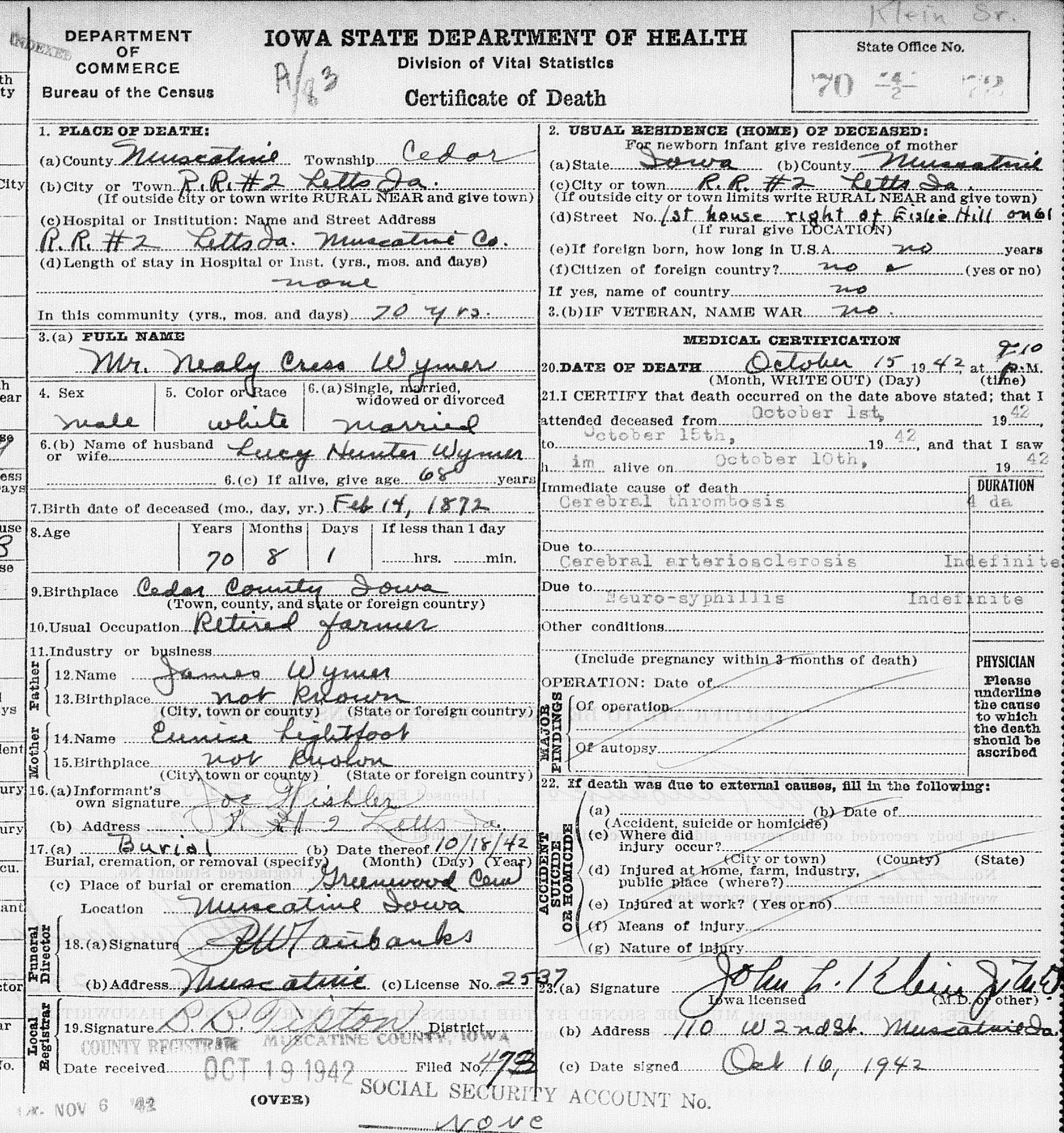 13 "Iowa, Death Records, 1904-1951," database with images, FamilySearch (https://www.familysearch.org/search/collection/2531337 : accessed 24 Oct 2019), Nealy Cress Wymer, 15 Oct 1942, Cedar Township, Muscatine, Iowa, United States; citing certificate #, State Historical Society of Iowa, Des Moines; FamilySearch digital folder 104072957.