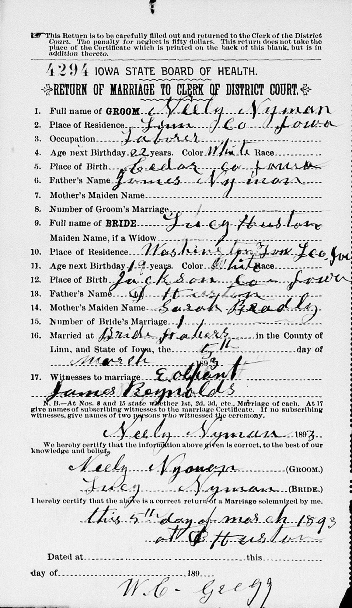 2 "Iowa, County Marriages, 1838-1934," database, FamilySearch (https://familysearch.org/search/collection/1805551 : accessed 17 Jul 2019), entry for Neely Nyman and Lucy Huston; citing reference 4294, county courthouses, Iowa; FHL microfilm 1,710,974.