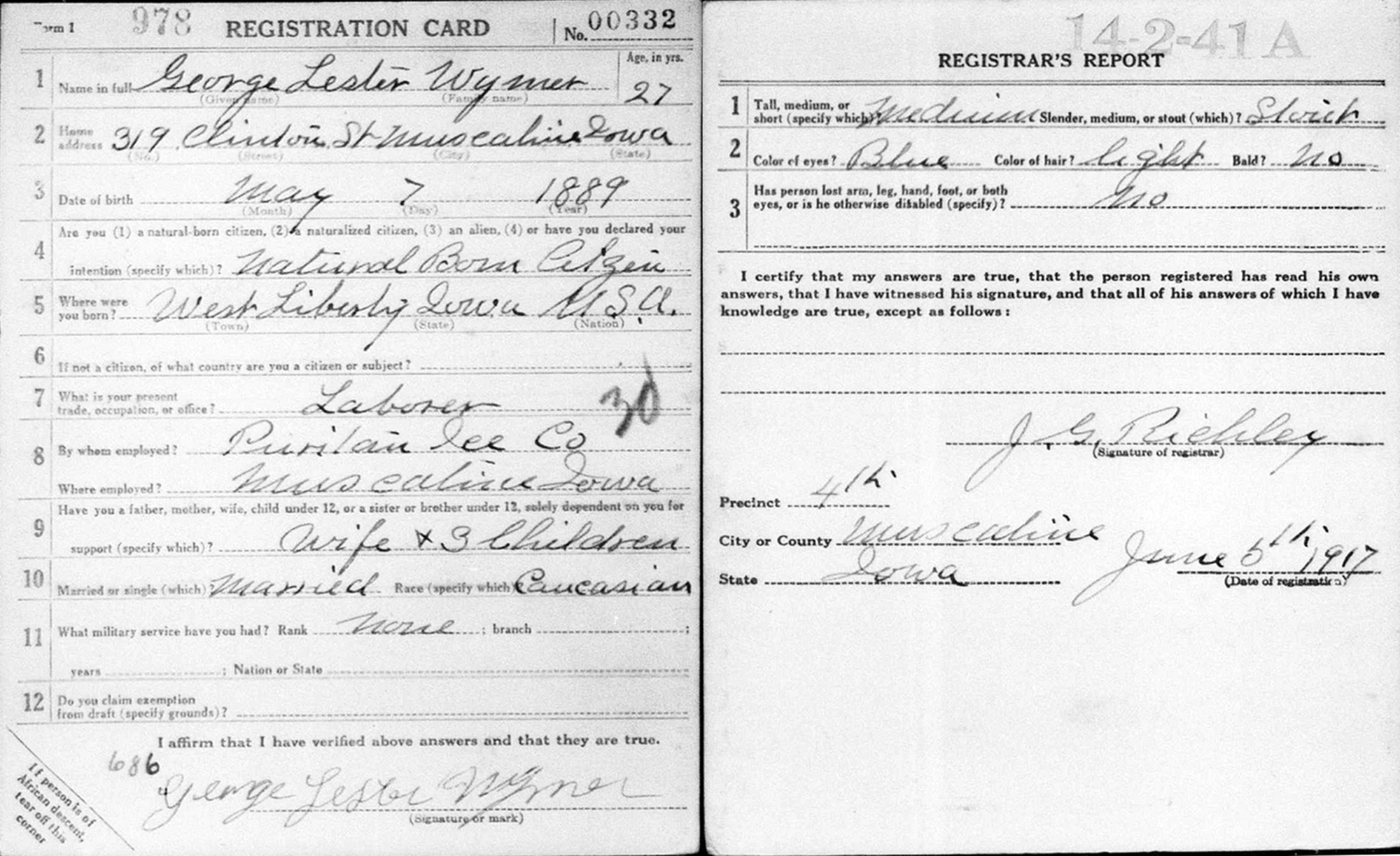 12 "United States World War I Draft Registration Cards, 1917-1918," database with images, FamilySearch.org (accessed 3 Jan 2014); Name: George Lester Wymer; Event Place: Muscatine County, Iowa.