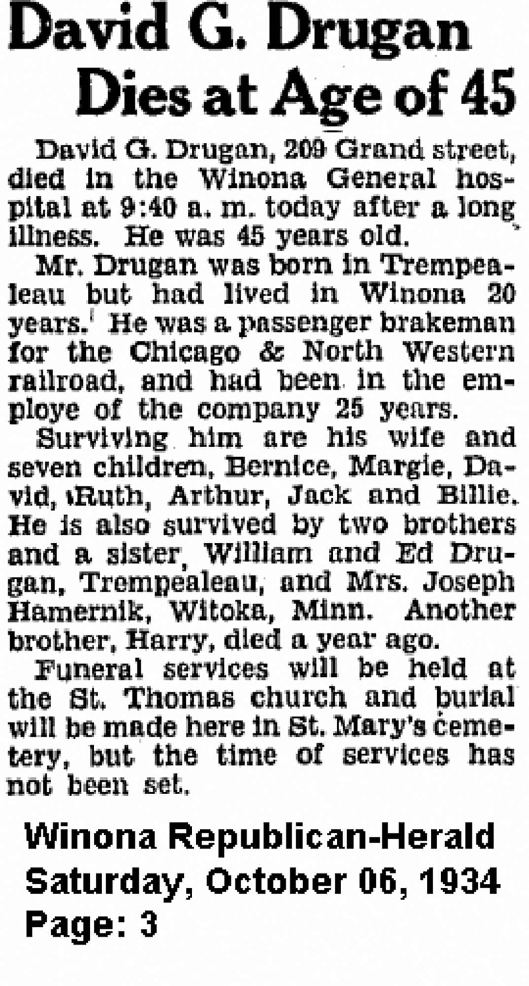 • His obituary was published in the Winona Republican-Herald on 6 October 1934 in Winona, MN. 16 David G. Drugan, 209 Grand Street, died in the Winona General hospital at 9:40 a.m. today after a long illness. He was 45 years old.