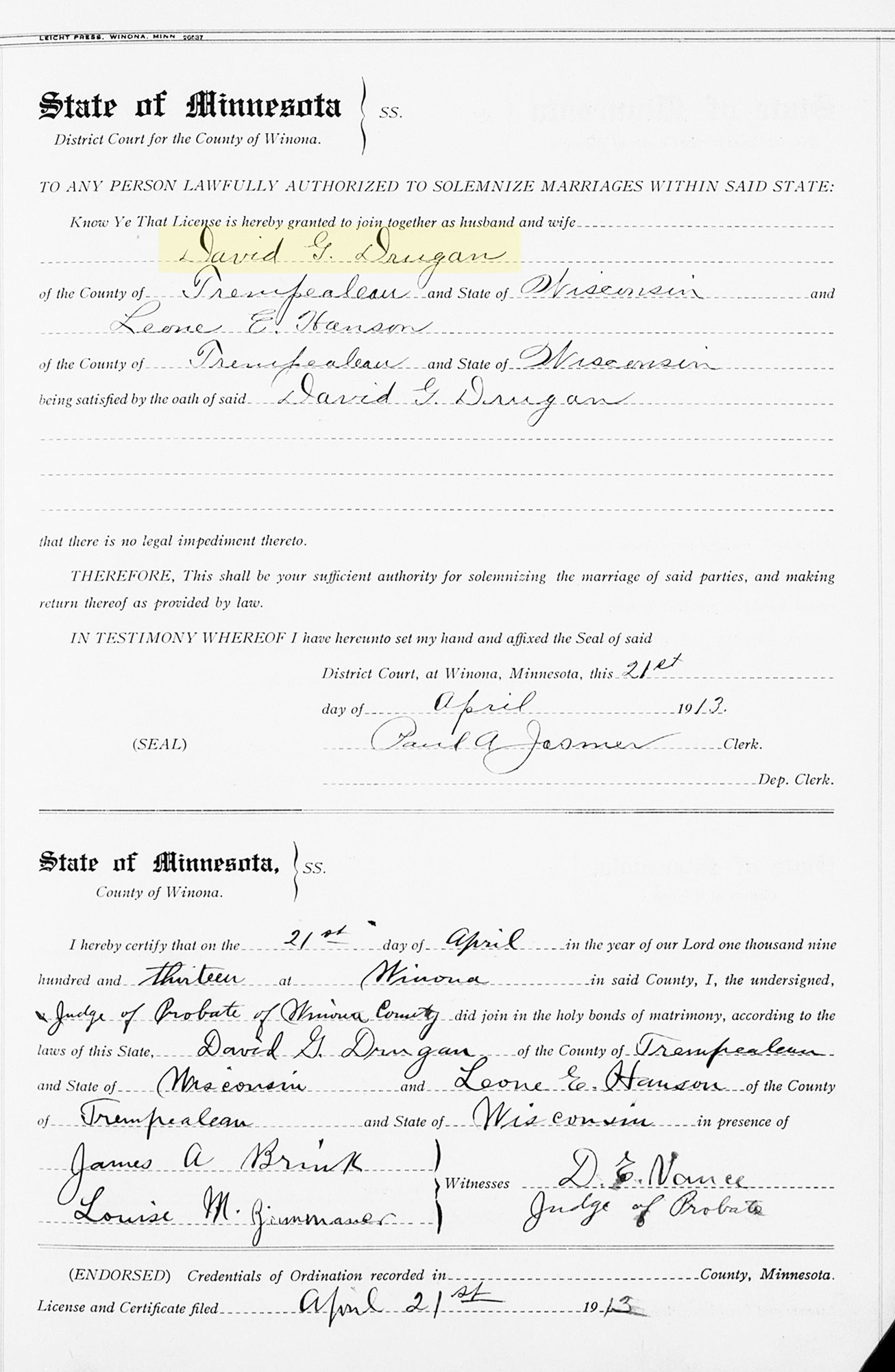 Name: David G Drugan Event Type: Marriage Event Date: 21 Apr 1913 Event Place: Winona, Minnesota, United States Event Place (Original): Winona, Minnesota, United States Gender: Male Spouse's Name: Leone E Hanson Spouse's Gender: Female Certificate Number: Page 32