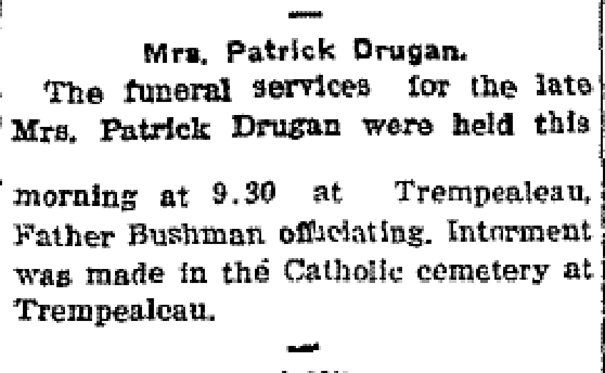 • Her obituary was published in the Winona Republican-Herald on 24 May 1915 in Winona, MN. 16 The funeral services for the late Mrs. Patrick Drugan were held this morning at 9:30 at Trempealeau, Father Bushman, officiating. Interment was made in the Catholic cemetery at Trempealeau.