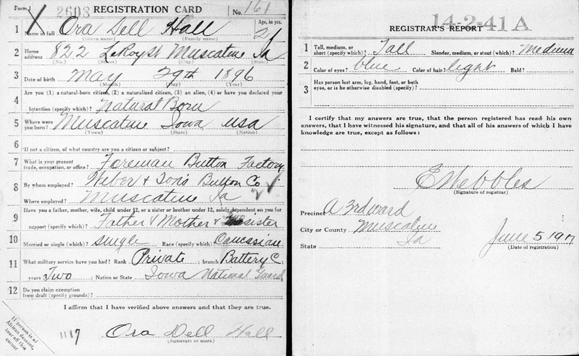 8 "United States World War I Draft Registration Cards, 1917-1918," database with images, FamilySearch.org (accessed 1 Jan 2014); Name: John Berry Hall; Event Place: Muscatine County, Iowa.