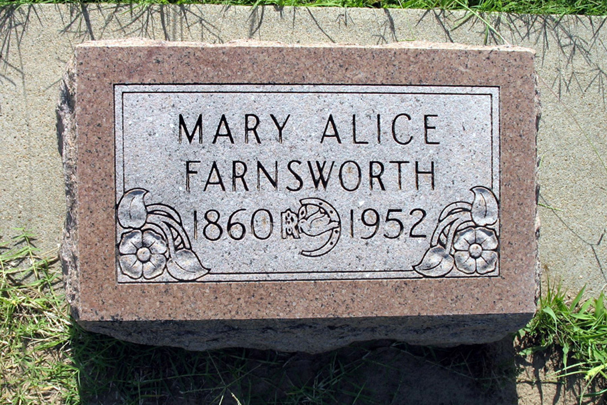 • She was buried in August 1952 in the Enid Cemetery in Enid, OK. Mary married Seba George Farnsworth after 1880 in Kansas.1 2 3 4 5 6 (Seba George Farnsworth was born in July 1856 in Virginia,1 3 died in February 1939 13 and was buried in February 1939 in Enid, OK 13.)