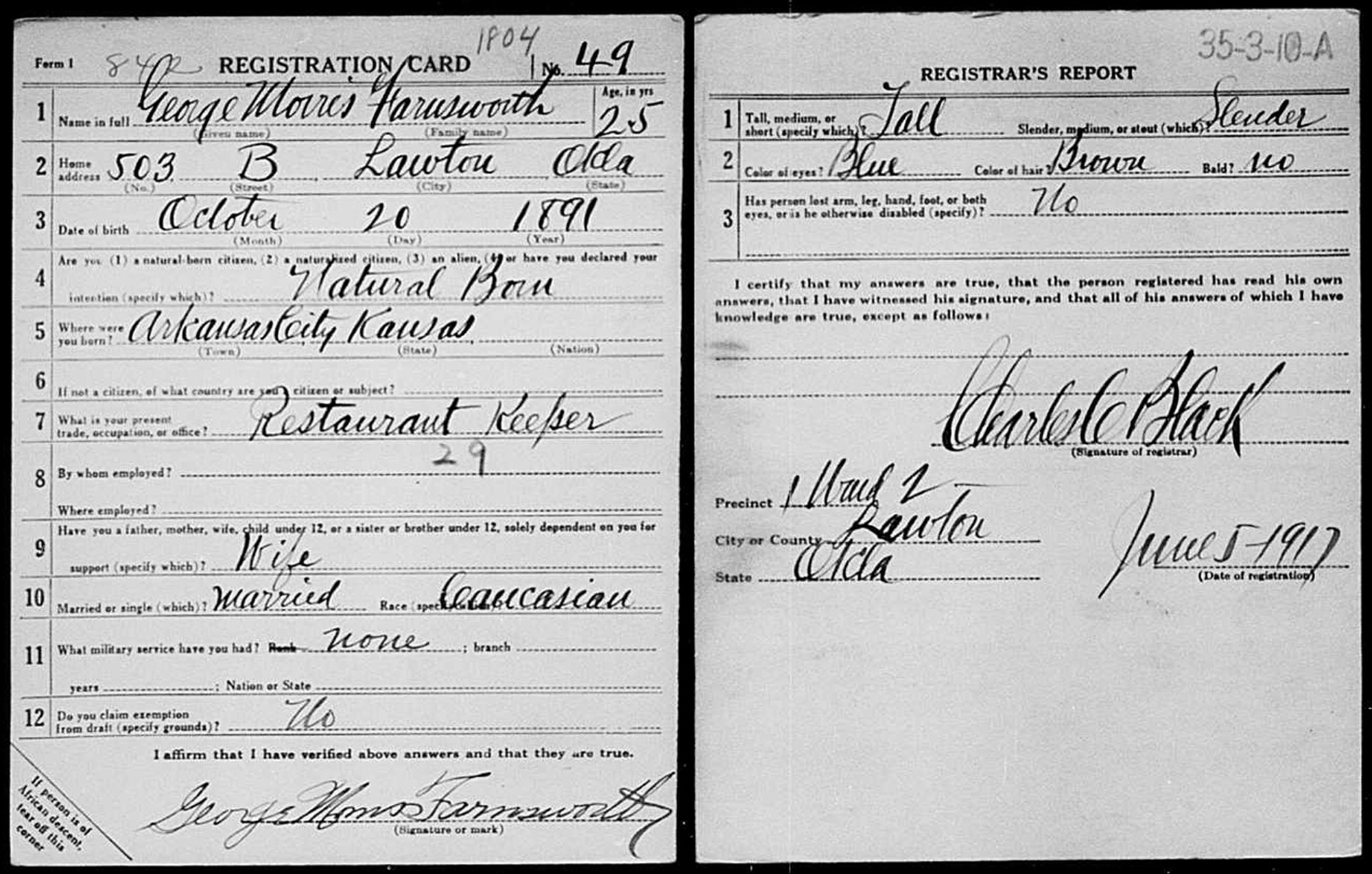 • He appeared on the 1900 US Census in Arkansas City, KS on 15 June 1900. 7 • 1905 Kansas State Census: 1 March 1905, in Arkansas City, KS. 8 1905 Kansas State Census • He appeared on the 1910 US Census in Arkansas City, KS on 29 April 1910. 9 • He appeared on the 1910 US Census in Arkansas City, KS on May 1910. 10 • His occupation on 5 June 1917 was a Restaurant Keeper in Lawton, OK. 5 • He resided at 503 B Street on 5 June 1917 in Lawton, OK.