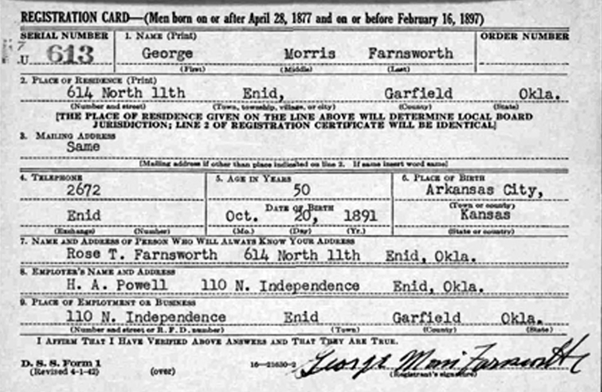 • On 5 June 1917, he registered for the World War I Draft at Lawton, OK. • He appeared on the 1920 US Census in Enid, OK on 1920. 2 • He appeared on the 1930 US Census in Enid, OK on 9 April 1930. 3 • He appeared on the 1940 US Census in Enid, OK on 11 April 1940. 4 • His occupation on 26 April 1942 was an Employee of H. A. Powell; 110 North Independence in Enid, OK. 6 • He resided at 614 North 11th Street on 26 April 1942 in Enid, OK.