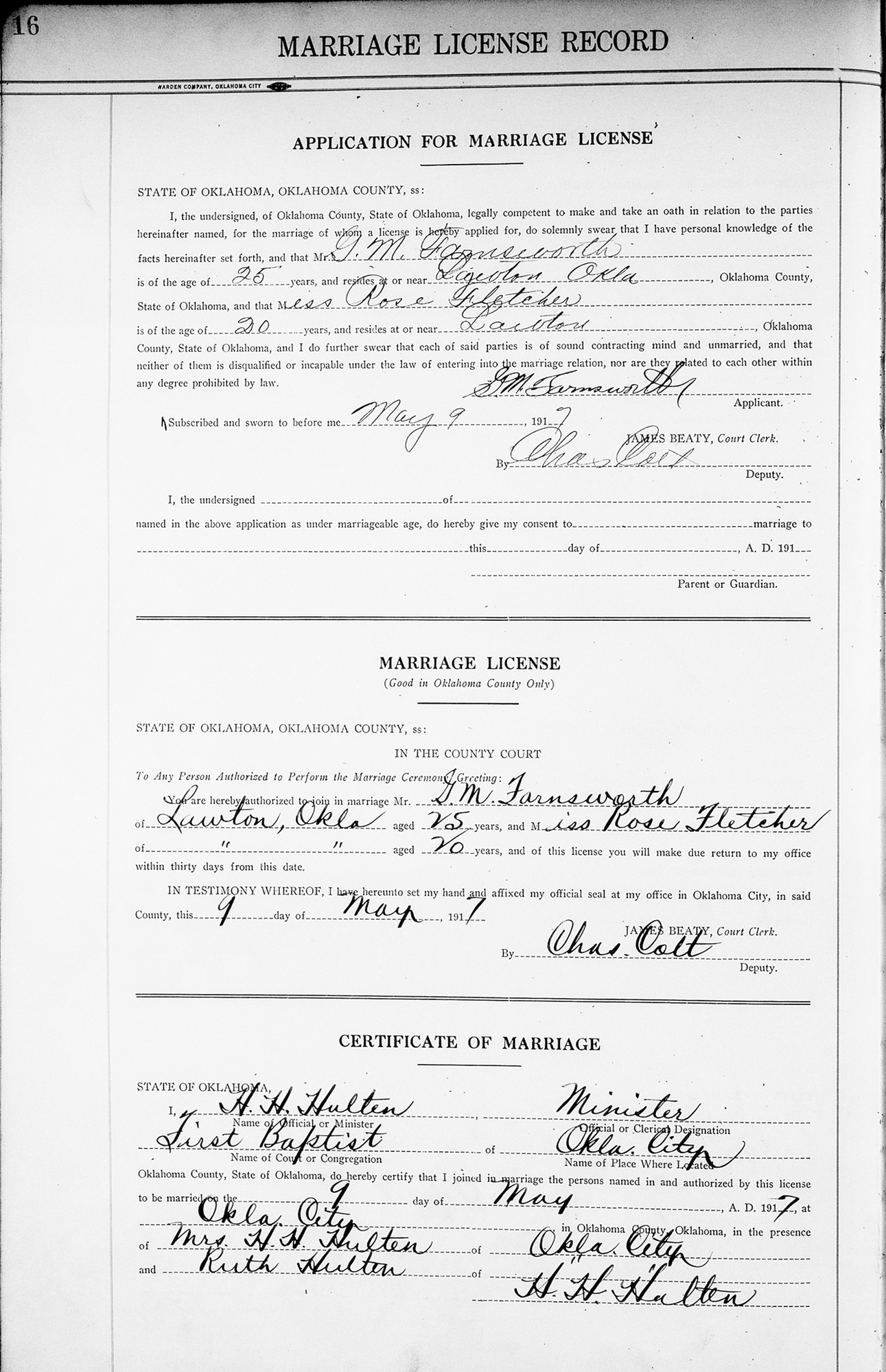 1 "Oklahoma, County Marriages, 1890-1995," database with images, FamilySearch (https://familysearch.org/search/collection/1709399 : accessed 10 Nov 2019); G M Farnsworth and Rose Fletcher, 09 May 1917; citing Oklahoma, various county courthouses, Oklahoma; FHL microfilm.