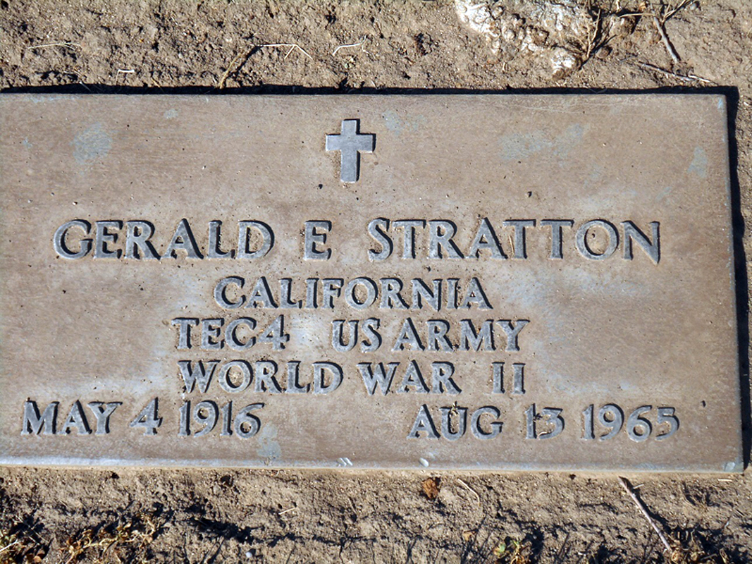Find A Grave, database and images (https://www.findagrave.com/ ); (accessed 31 October 2019), memorial page for Gerald Edward Stratton (4 May 1916-13 Aug 1965), Find A Grave Memorial no. 149927437, citing Sierra Hills Memorial Park, Sacramento, Sacramento County, California, USA