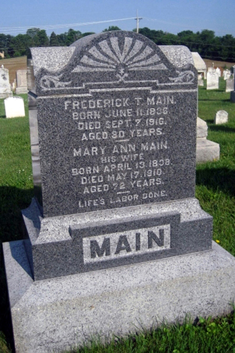 Find A Grave, database and images (https://www.findagrave.com/ ); accessed 13 March 2019), memorial page for Frederick Tobias Main (11 Jun 1836\endash 7 Sep 1916), Find A Grave Memorial no. 10701315, citing Zion Lutheran Cemetery, Middletown, Frederick County, Maryland, USA