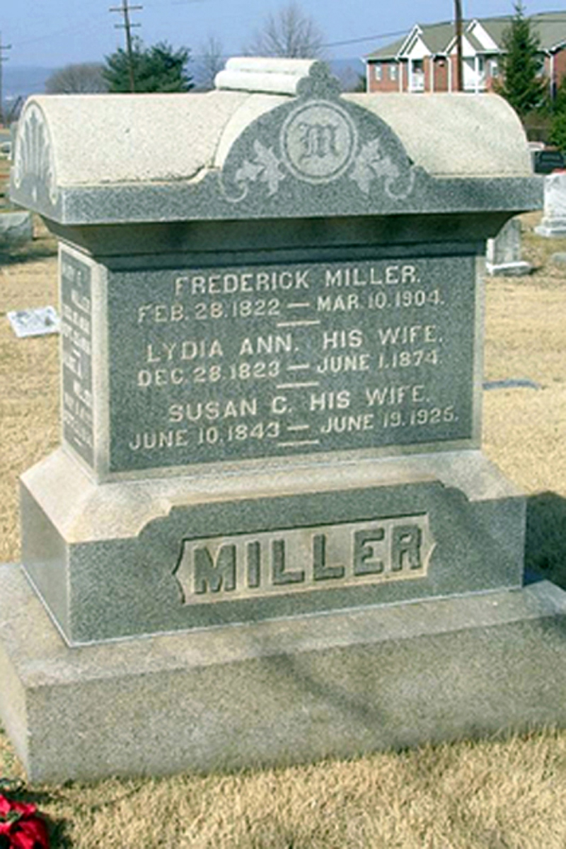 • She was buried after 1 June 1874 in the Saint Pauls Lutheran Cemetery in Jefferson, MD. Lydia married Frederick Miller on 4 November 1846 in , Frederick County, MD.1 (Frederick Miller was born on 28 February 1822 in Hanover, PA,4 7 9 10 died on 10 March 1904 in , Montgomery County, MD 7 10 and was buried after 10 March 1904 in Jefferson, MD 10.)