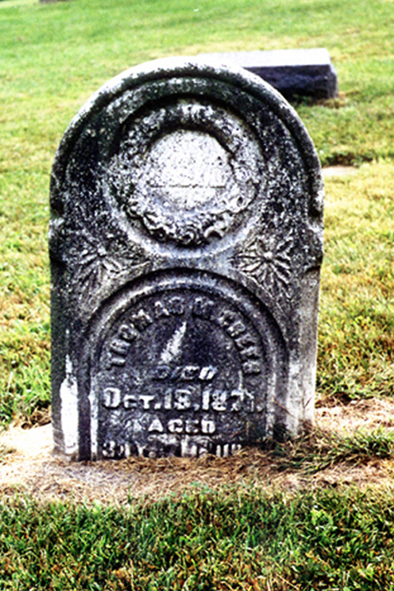 • He was buried after 19 October 1871 in the West Bethel Cemetery in Iowa Township, Cedar County, IA. Thomas married Mary Jane Guild on 5 March 1857 in , Muscatine County, IA.1 (Mary Jane Guild was born in 1840 in Ohio 3 4 and died after 1870.)