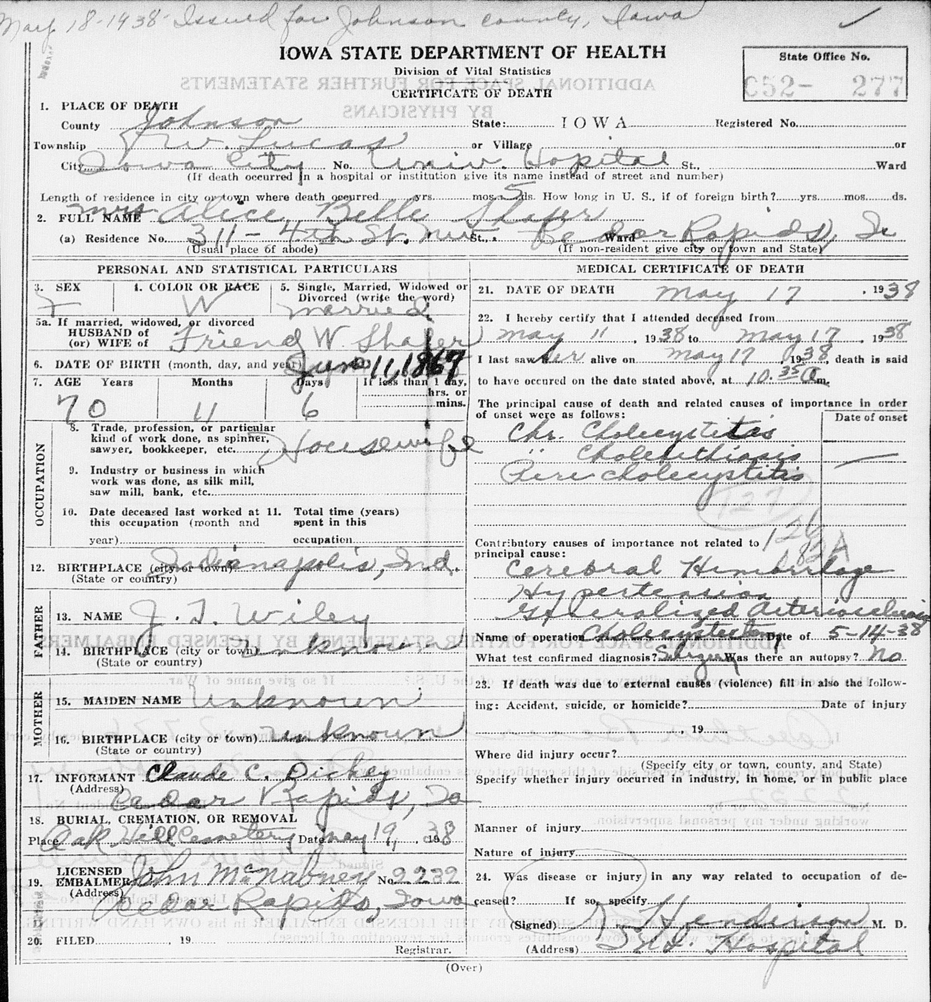 9 "Iowa, Death Records, 1904-1951," database with images, FamilySearch (https://www.familysearch.org/search/collection/2531337 : accessed 31 July 2020), Alice Belle Shafer, 17 May 1938, Iowa, Iowa, United States; citing certificate #52277, State Historical Society of Iowa, Des Moines; FamilySearch digital folder 101821072.