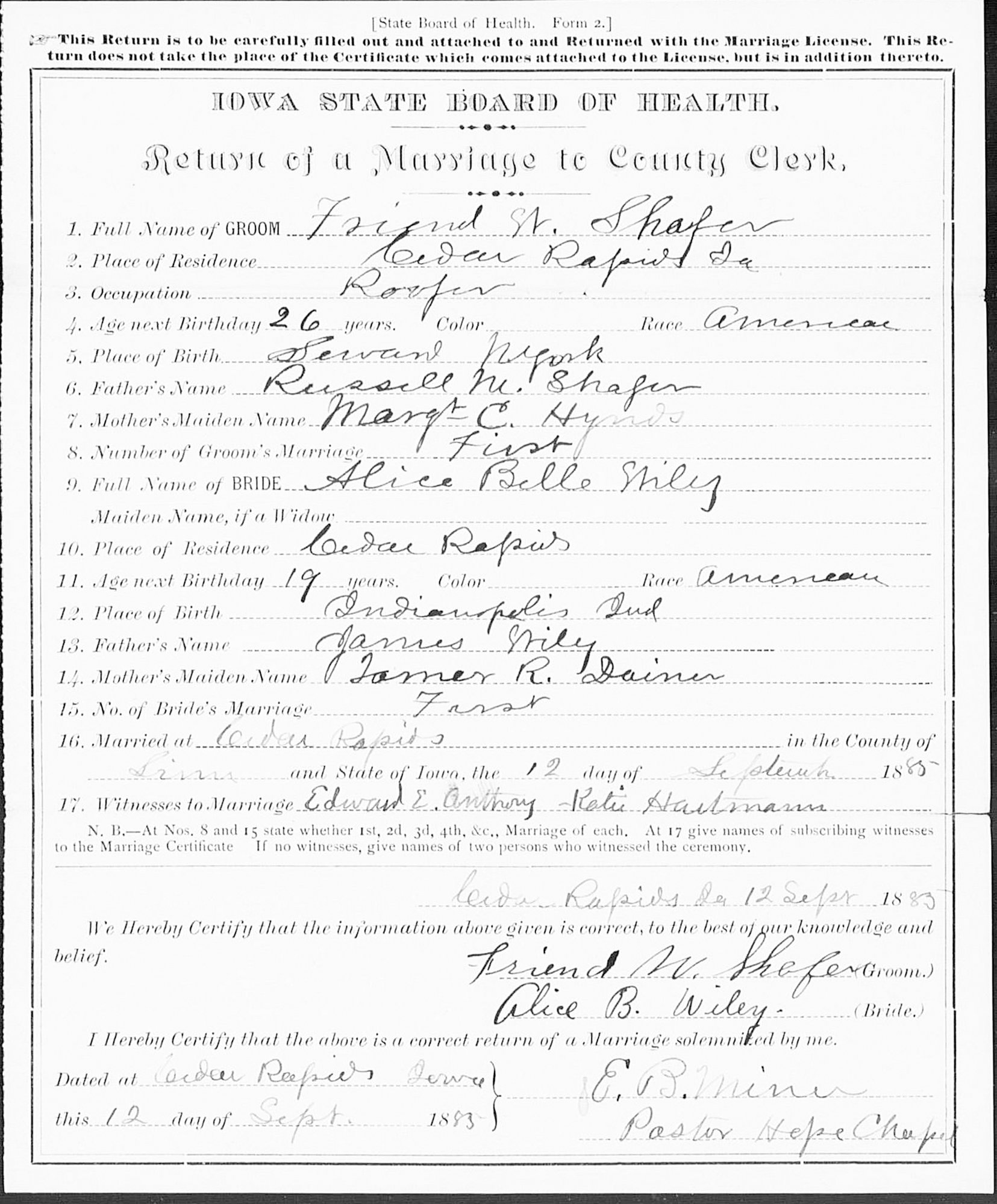 1 "Iowa, County Marriages, 1838-1934," database, FamilySearch (https://familysearch.org/search/collection/1805551 : accessed 16 Mar 2014), Friend W. Shafer and Alice Belle Wiley, 12 Sep 1885, Linn, Iowa, United States; citing reference Item 1, county courthouses, Iowa; FHL microfilm 1,710,980.