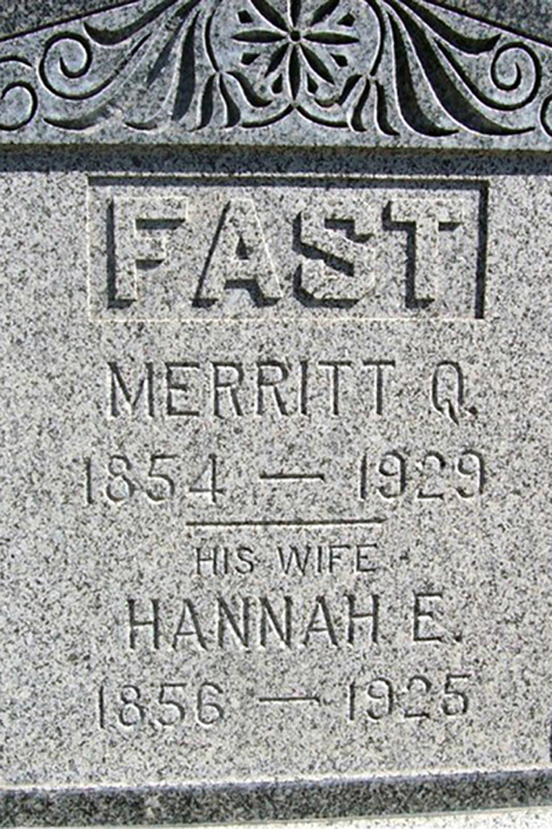 2 1880 U.S. census, population schedule, Banner Township, Fulton County, Illinois, enumeration district (ED) 31, p. 37D, dwelling 130, family 135, Merritt Quincy Fast and Hannah E. Rankin; index and images, FamilySearch.org (accessed 21 Sep 2017); citing National Archives and Records Administration microfilm T9, roll 207.