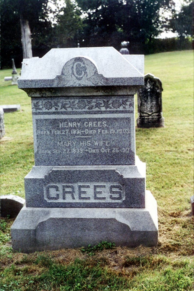 • She was buried after 26 October 1917 in the West Bethel Cemetery in Iowa Township, Cedar County, IA. Mary married Henry Crees, son of John Haner Crees and Sarah McLaughlin, about 1861.1 2 (Henry Crees was born on 27 February 1831 in Pennsylvania,1 2 5 6 died on 19 February 1903 6 and was buried after 19 February 1903 in Iowa Township, Cedar County, IA 6.)