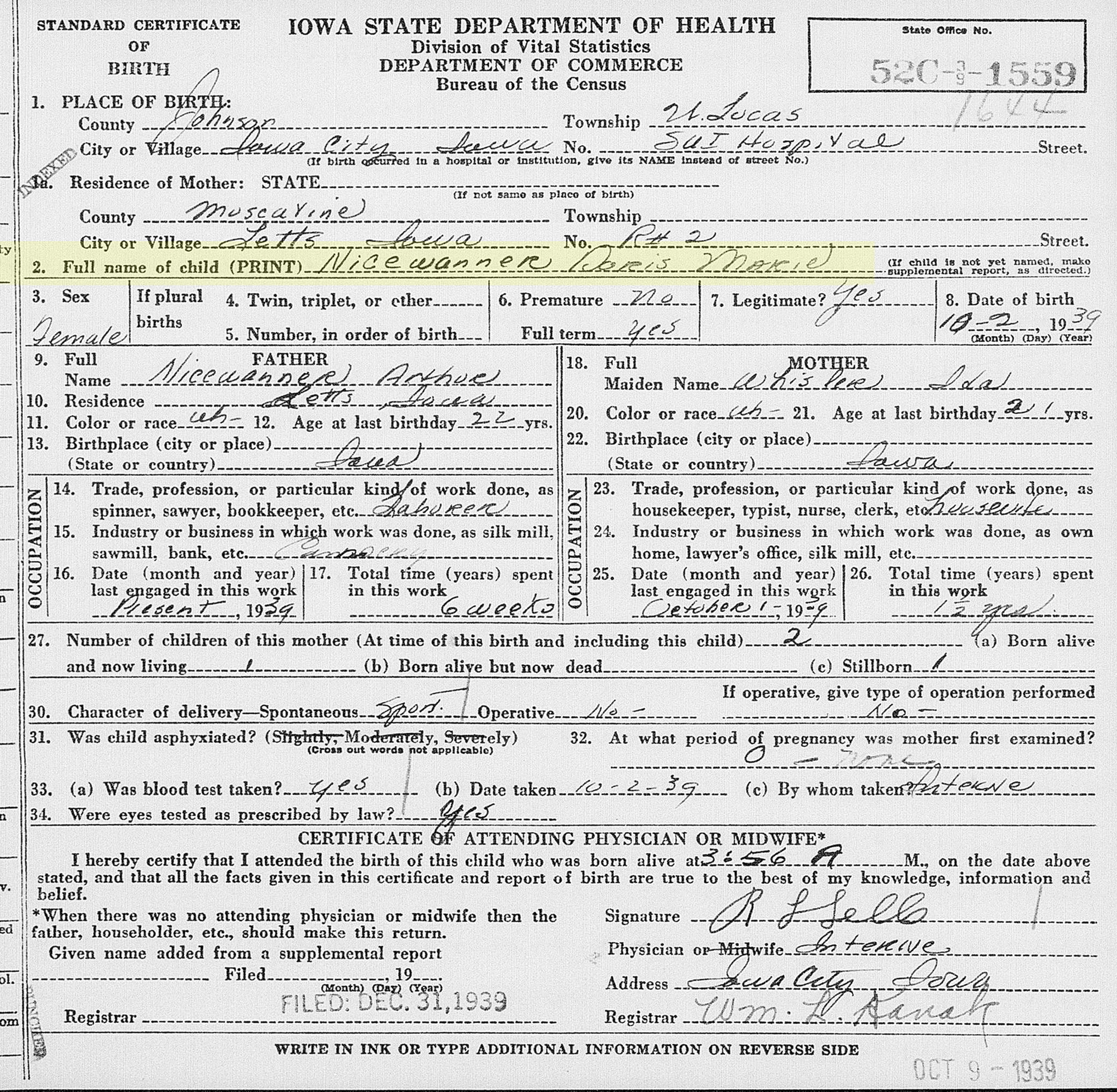 1 "Iowa, Birth Records, 1921-1942," database, FamilySearch (https://www.familysearch.org/search/collection/2849548 : accessed 17 Jul 2019), entry for Doris Marie Nicewanner, 2 Oct 1939; citing Birth, West Lucas Township, Johnson, Iowa, United States, State Historical Society of Iowa, Des Moines.
