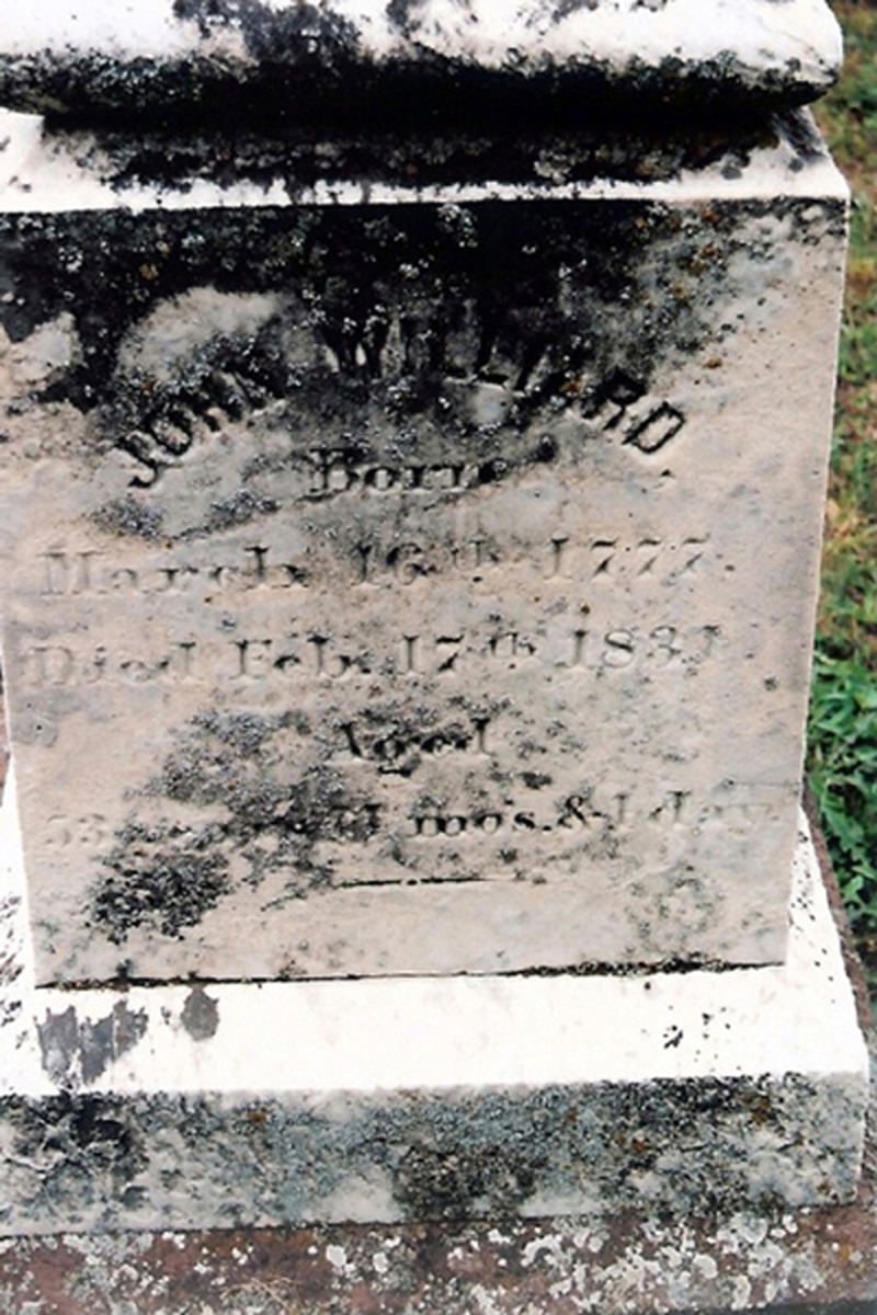 2 Find A Grave, database and images (https://www.findagrave.com/ ); accessed 9 April 2019), memorial page for John Willard (16 Mar 1777\endash 17 Feb 1831), Find A Grave Memorial no. 16382562, citing Burkittsville Union Cemetery, Burkittsville, Frederick County, Maryland, USA