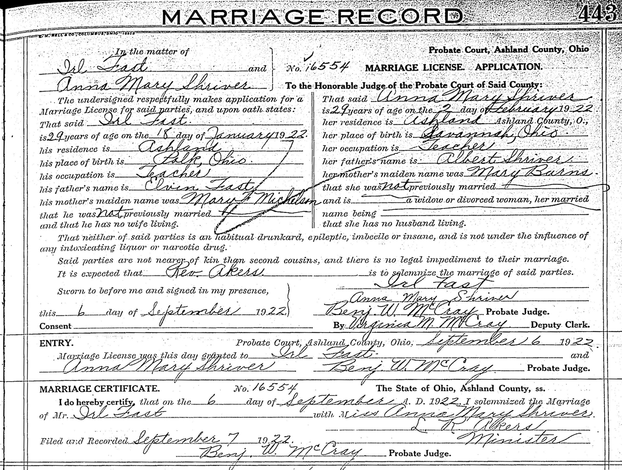 Name: Irl Fast Event Type: Marriage Event Date: 06 Sep 1922 Event Place: Ashland, Ohio, United States Age: 29 Birth Year (Estimated): 1893 Birthplace: Polk, Ohio Father's Name: Elvin Fast Mother's Name: Mary Michelson Spouse's Name: Anna Mary Shriver Spouse's Age: 29 Spouse's Birth Year (Estimated): 1893 Spouse's Birthplace: Savannah, Ohio Spouse's Father's Name: Albert Shriver Spouse's Mother's Name: Mary Burns