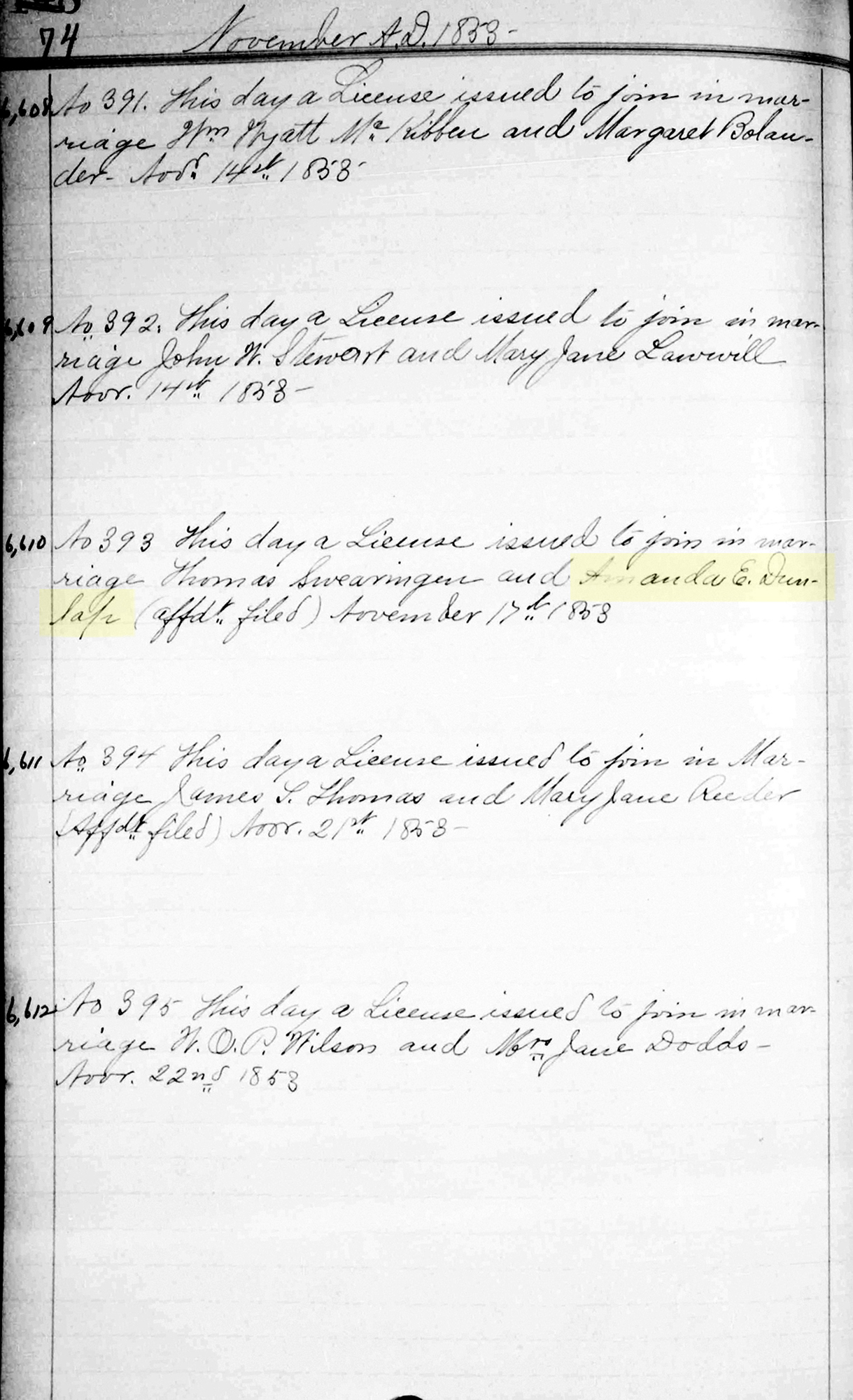 3 "Ohio, County Marriages, 1789-2016," database with images, FamilySearch.org (accessed 28 February 2021); (https://familysearch.org/ark:/61903/1:1:XZ4V-PP8 : 26 August 2019), Thomas Swearengen and Amanda E. Dunlap, 18 Nov 1853; citing Marriage, Brown, Ohio, United States, bk G p 74, Franklin County Genealogical & Historical Society, Columbus; FHL microfilm.