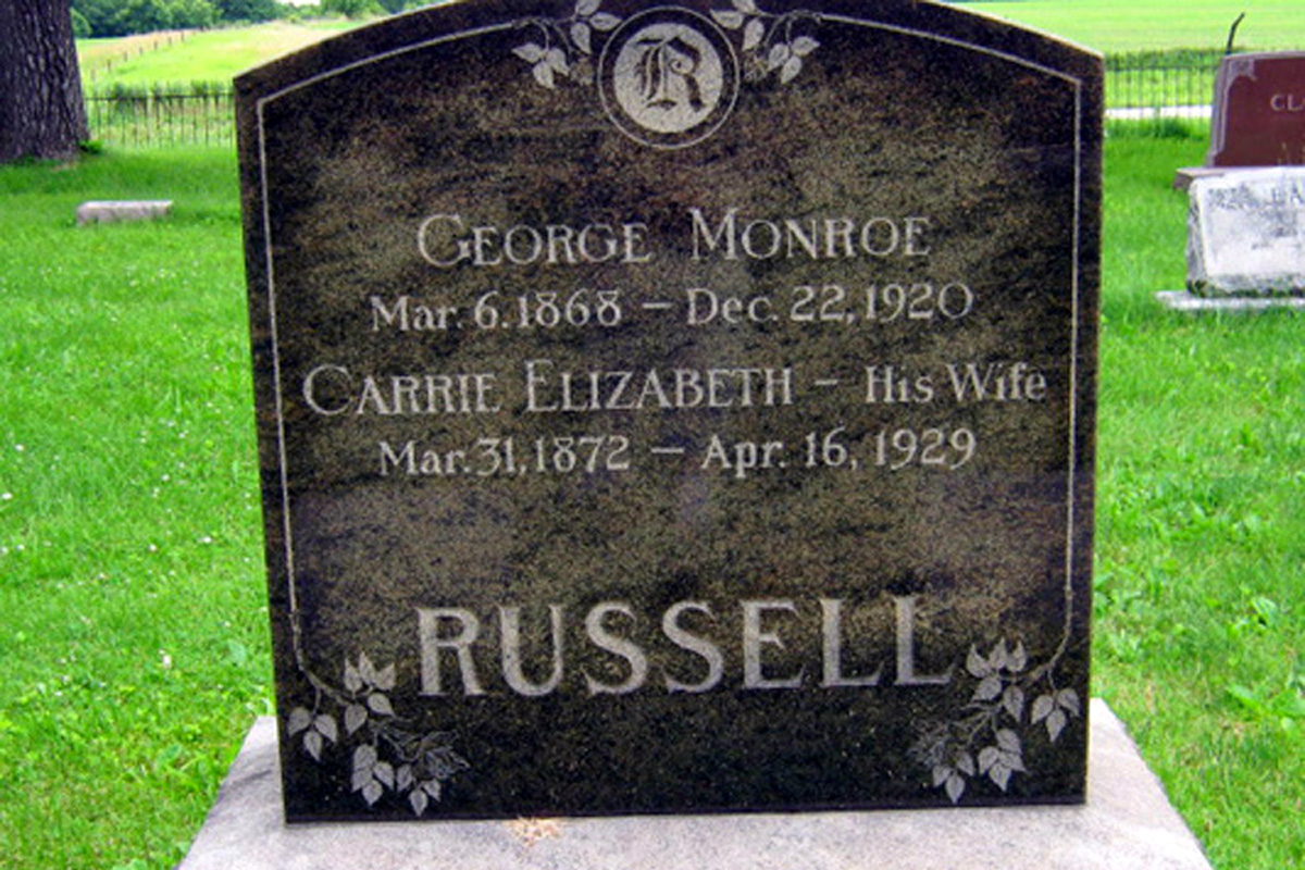 • She was buried on 18 April 1929 in the Cedar Township Cemetery in Fremont, IA. Carrie married George Monroe Russell, son of James Monroe Russell and Rose Anne Coburn, on 30 September 1891 in , Wapello County, IA.1 2 3 (George Monroe Russell was born on 6 March 1868 in , Mahaska County, IA,2 3 8 died on 22 December 1920 in Iowa 8 9 and was buried after 22 December 1920 in Fremont, IA 8 9.)
