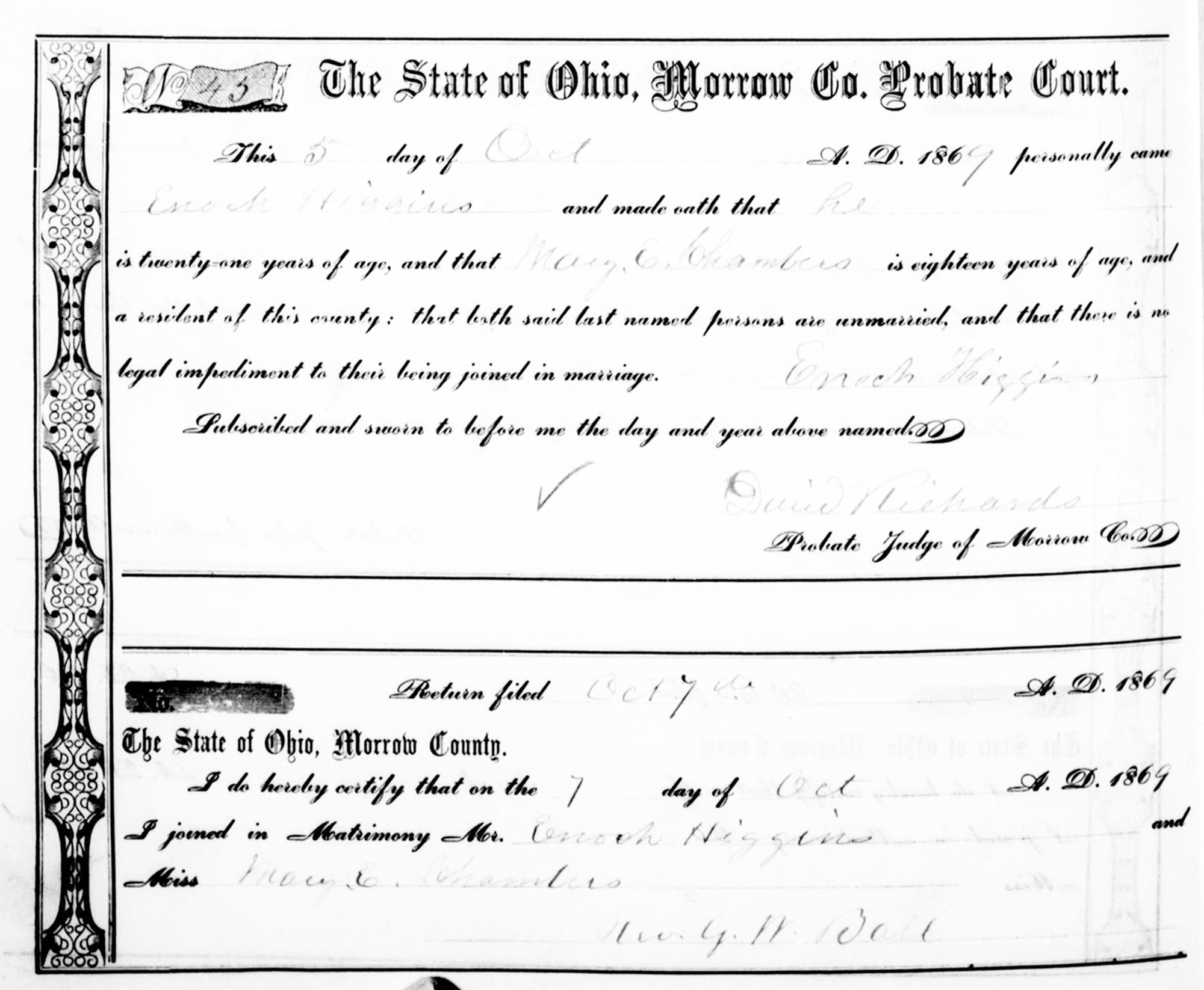 1 "Ohio, County Marriages, 1789-2016," database with images, FamilySearch.org (accessed 8 Sep 2022); Name: Enoch Higgins; Spouse's Name: Mary E. Chambers.