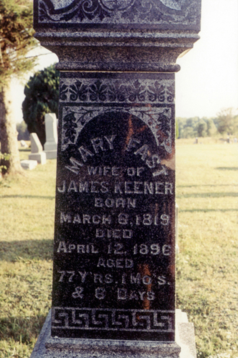 • She was buried after 12 April 1896 in the Polk Cemetery in Ashland, OH. Mary married James Keener on 26 June 1834 in , Wayne County, OH.1 2 (James Keener was born on 2 April 1812 in Pennsylvania,2 3 4 5 7 died on 29 June 1892 in , Wayne County, OH 3 7 and was buried after 29 June 1892 in Polk, OH 3 7.)