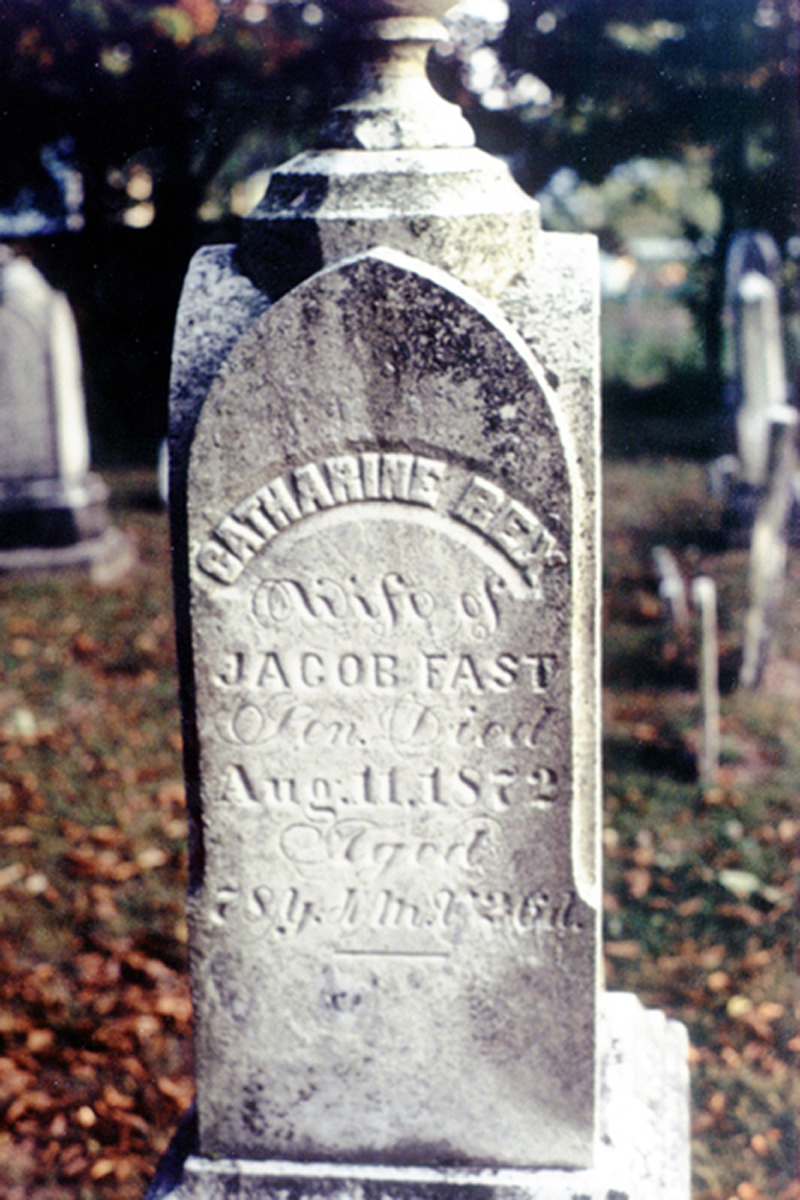 • She was buried after 11 August 1872 in the Saint Luke's Cemetery in Orange Township, Ashland, OH. Catharine married Jacob Martin Fast, son of Christian Fast and Anna Barbara Mason, in 1812.1 (Jacob Martin Fast was born on 13 March 1788 in , Greene County, PA,3 4 6 7 died on 11 April 1875 in Orange Township, Ashland, OH 3 7 and was buried after 11 April 1875 in Orange Township, Ashland, OH 3 7.)