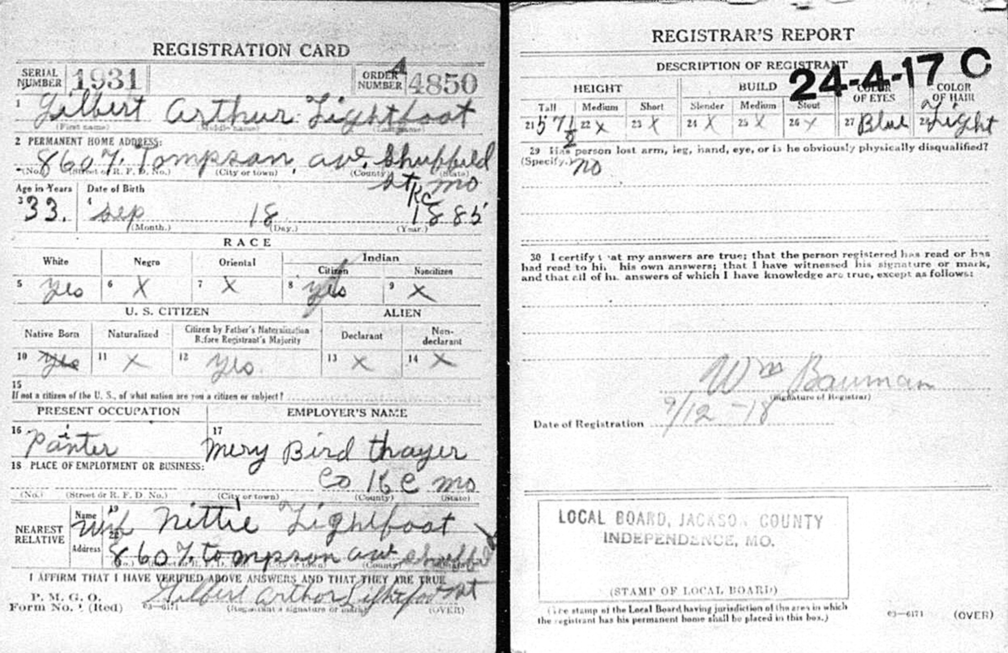 7 "United States World War I Draft Registration Cards, 1917-1918," database with images, FamilySearch.org (accessed 14 May 2014); Name: Gilbert Arthur Lightfoot; Event Place: Jackson County, Missouri, United States.