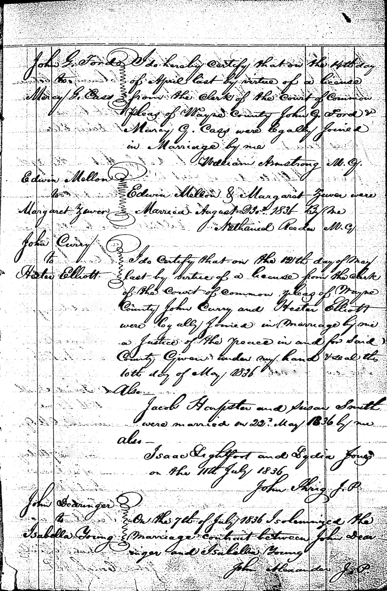 • Marriage Image: 11 July 1836, in Wooster, Wayne, Ohio, United States. 1 • They appeared on the 1840 US Census in Clinton Township, Wayne, OH on June 1840. 10 • They appeared on the 1850 US Census in Franklin Township, Kosciusko, IN on 24 October 1850. 6 • They appeared on the 1860 US Census in Center Township, La Porte, IN on 3 July 1860. 7 • They appeared on the 1870 US Census in Hurricane Township, Carroll, MO on 23 August 1870. 8 • They appeared on the 1880 US Census in Wood Township, Carroll County, MO on 8 June 1880. 4