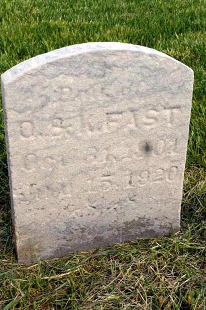 The gravestone for Mildred reads "Mildred M. Fast (on top edge), Daughter of O. & K. Fast, Oct. 31, 1901, July 15, 1920".