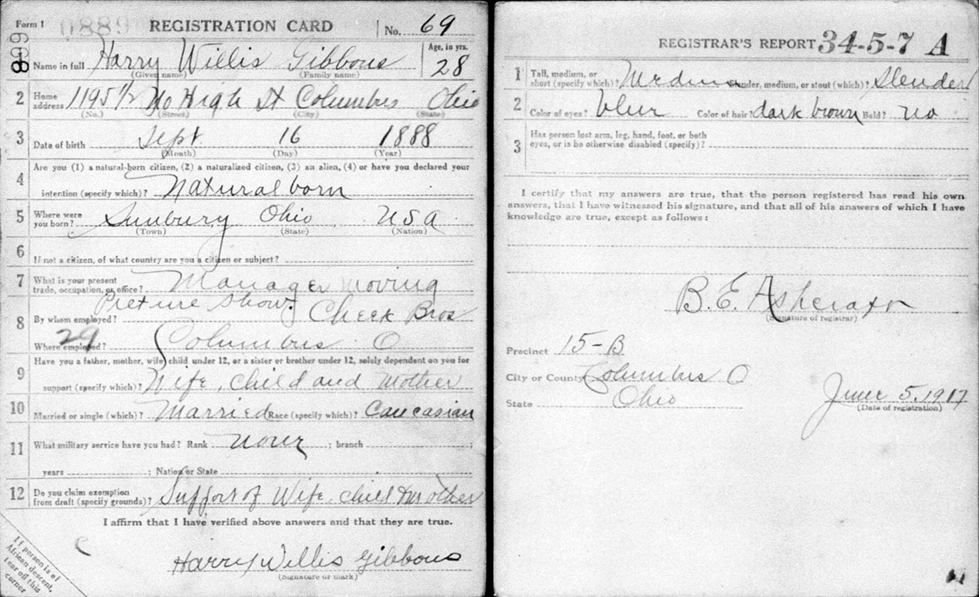 7 "United States World War I Draft Registration Cards, 1917-1918," database with images, FamilySearch.org (accessed 3 Feb 2014); Name: Harry Willis Gibbons; Event Place: Columbus City no 4, Ohio.