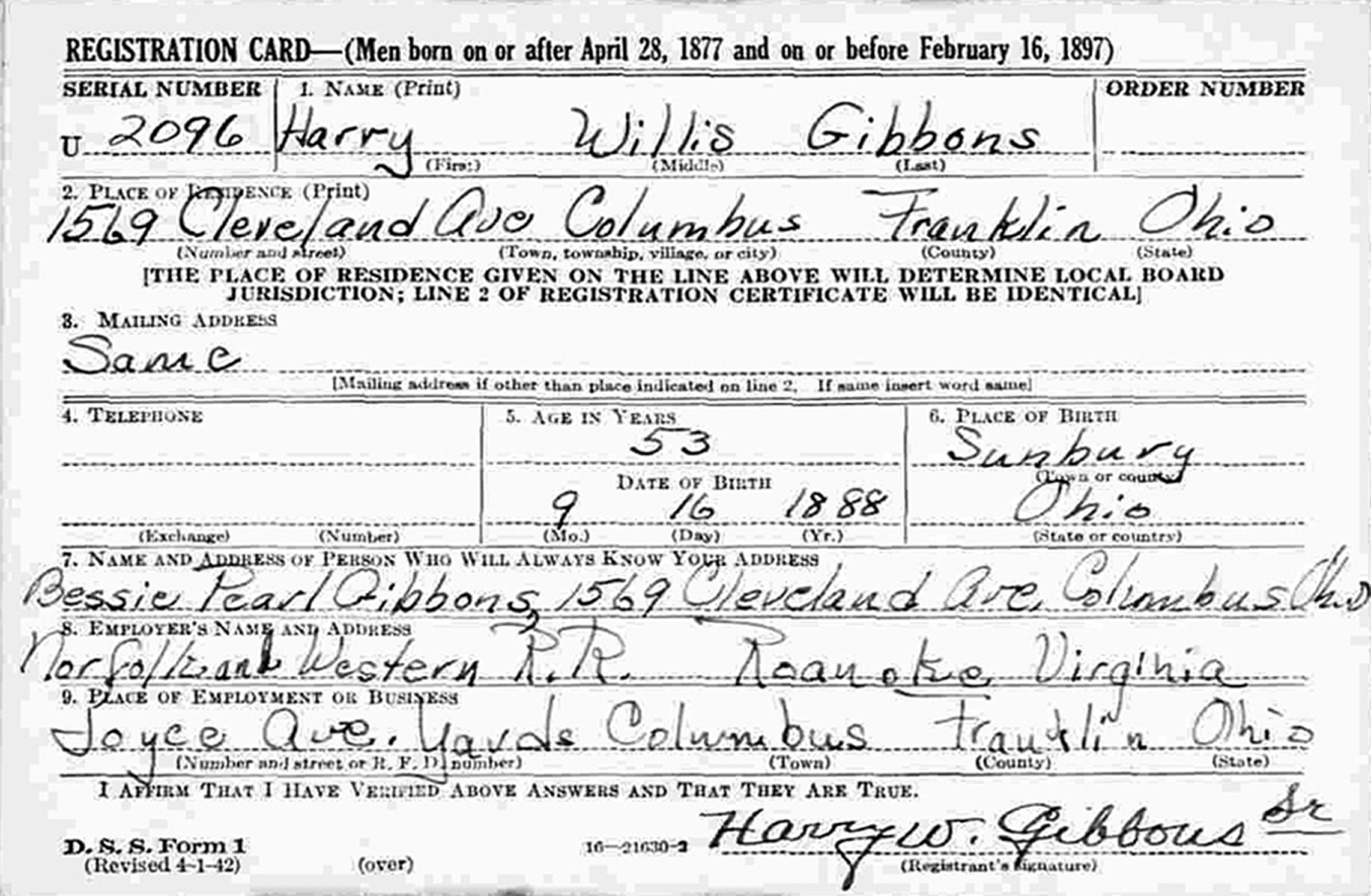 • Harry Willis Gibbons registered for WW II Draft: 1942, Columbus, Franklin County, OH.