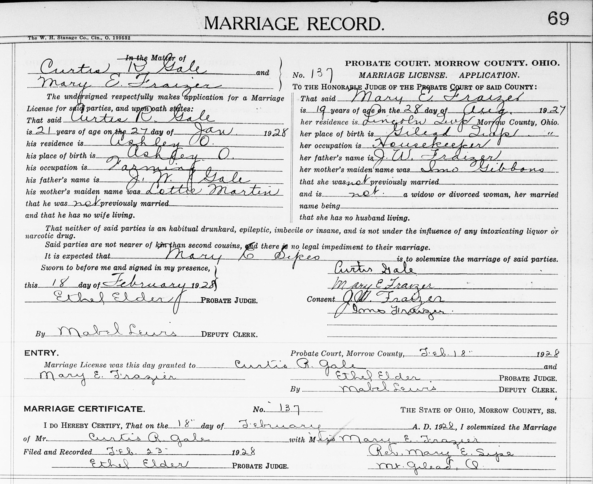 1 "Ohio, County Marriages, 1789-2016," database with images, FamilySearch.org (accessed 4 Feb 2014); Name: Curtis R Gale; Spouse's Name: Mary E Fraizer; Event Date: 18 Feb 1928; Event Place: Morrow, Ohio.
