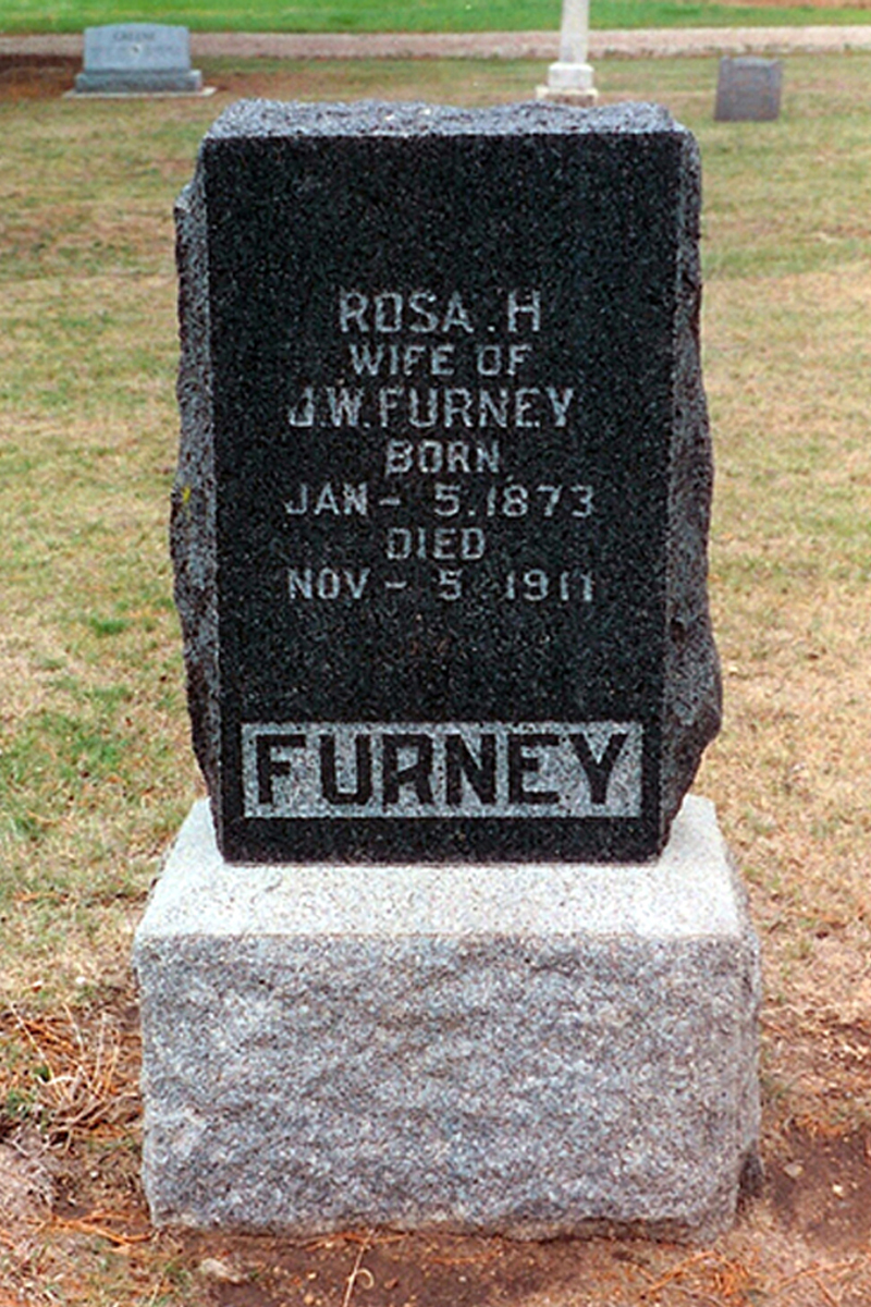 • She was buried after 5 November 1911 in the Greenlawn in Pratt, KS. Rosa married James William Furney, son of Solomon Ritz Furney and Sarah Catherine Darner, on 26 February 1895 in Central City, KS.1 2 (James William Furney was born on 18 September 1868 in Zanesville, OH,1 2 4 5 6 died on 26 September 1937 in West Plains, MO 6 and was buried on 29 September 1937 in Greenlawn Cemetery, Pratt, Pratt, Kansas, United States 6.)