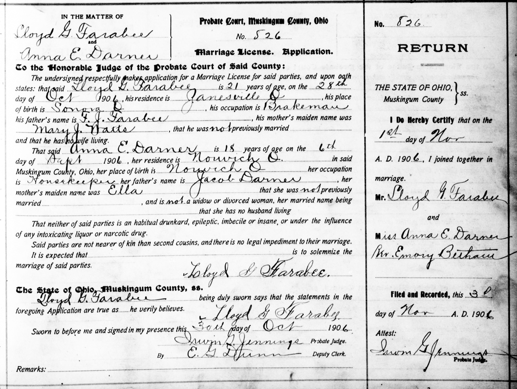 1 "Ohio, County Marriages, 1789-2016," database with images, FamilySearch.org (accessed 27 Feb 2014); Name: Lloyd G. Farabee; Event Date: 01 Nov 1906; Event Place: Muskingum, Ohio.