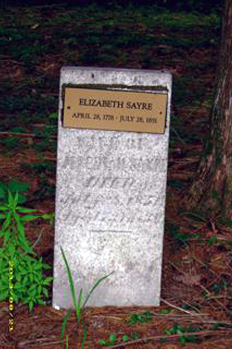 • She was buried after 28 July 1851 in the Sayre Cemetery in Barbour County, WV. Elizabeth married Jedediah Sayre, son of David Sayre and Hannah Frazier, on 23 March 1797 in Smithtown, WV.1 2 3 4 5 (Jedediah Sayre was born on 1 July 1772 in Maryland,2 3 4 5 9 10 died on 16 December 1855 in Taylor Drain, VA 2 3 4 5 9 10 and was buried after 16 December 1855 in Barbour County, VA 5 10.) |