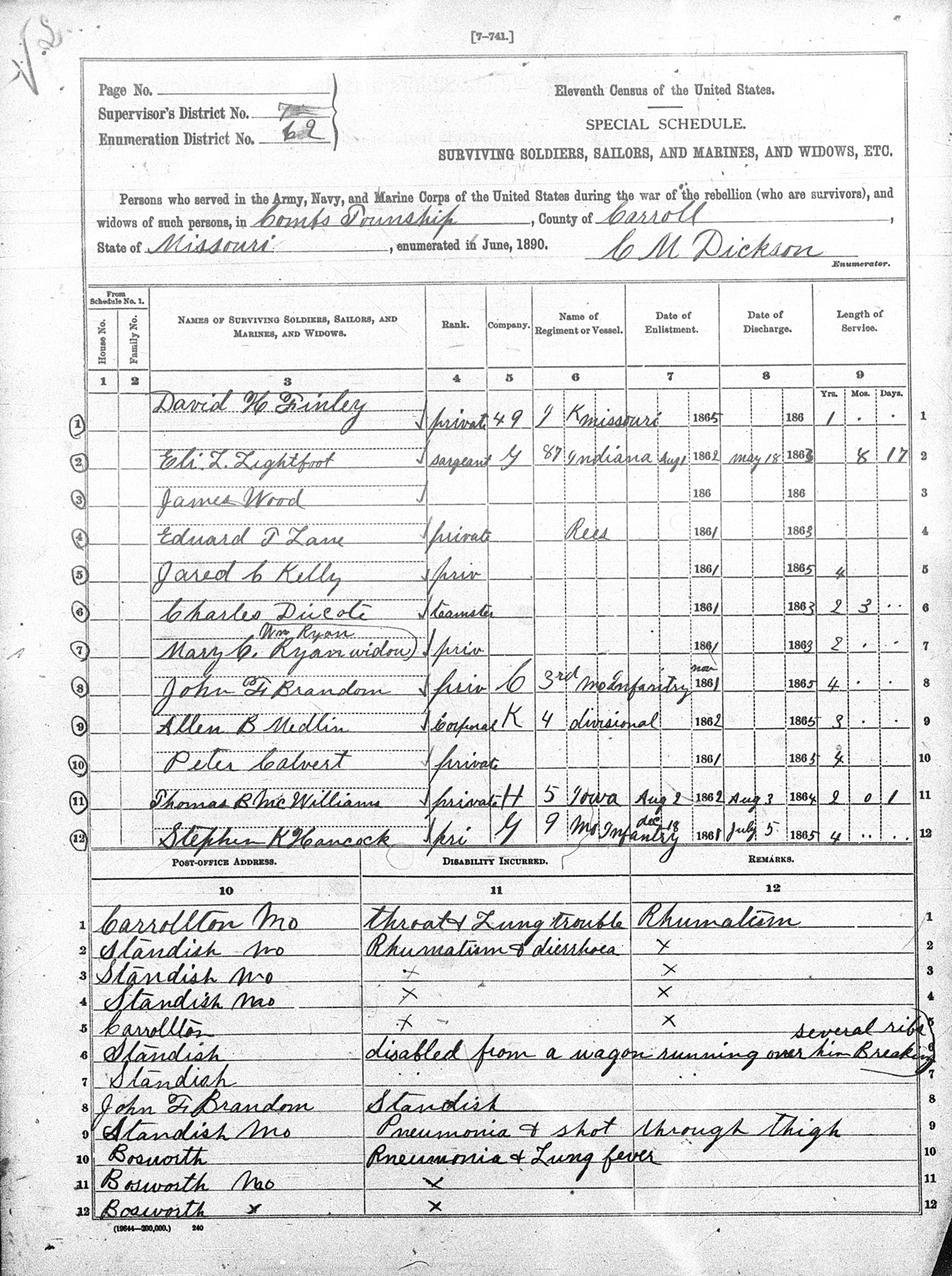 • Military: Civil War, August 1862 to May 1863, Indiana. 18 Sergeant, Co. G, 87th Indiana; Aug 1862 to May 1863. • He appeared on the 1870 US Census in Hurricane Township, Carroll, MO on 23 August 1870. 12 • He appeared on the 1880 US Census in Wood Township, Carroll County, MO on 8 June 1880. 2