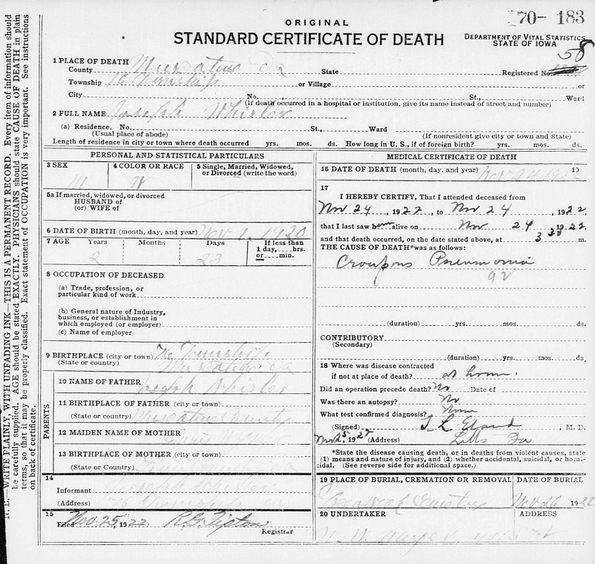 "Iowa, Death Records, 1904-1951," database with images, FamilySearch (https://www.familysearch.org/search/collection/2531337 : accessed 17 Jul 2019), entry for Joseph Whisler, 24 Nov 1922, Iowa; citing certificate #70183, State Historical Society of Iowa, Des Moines.