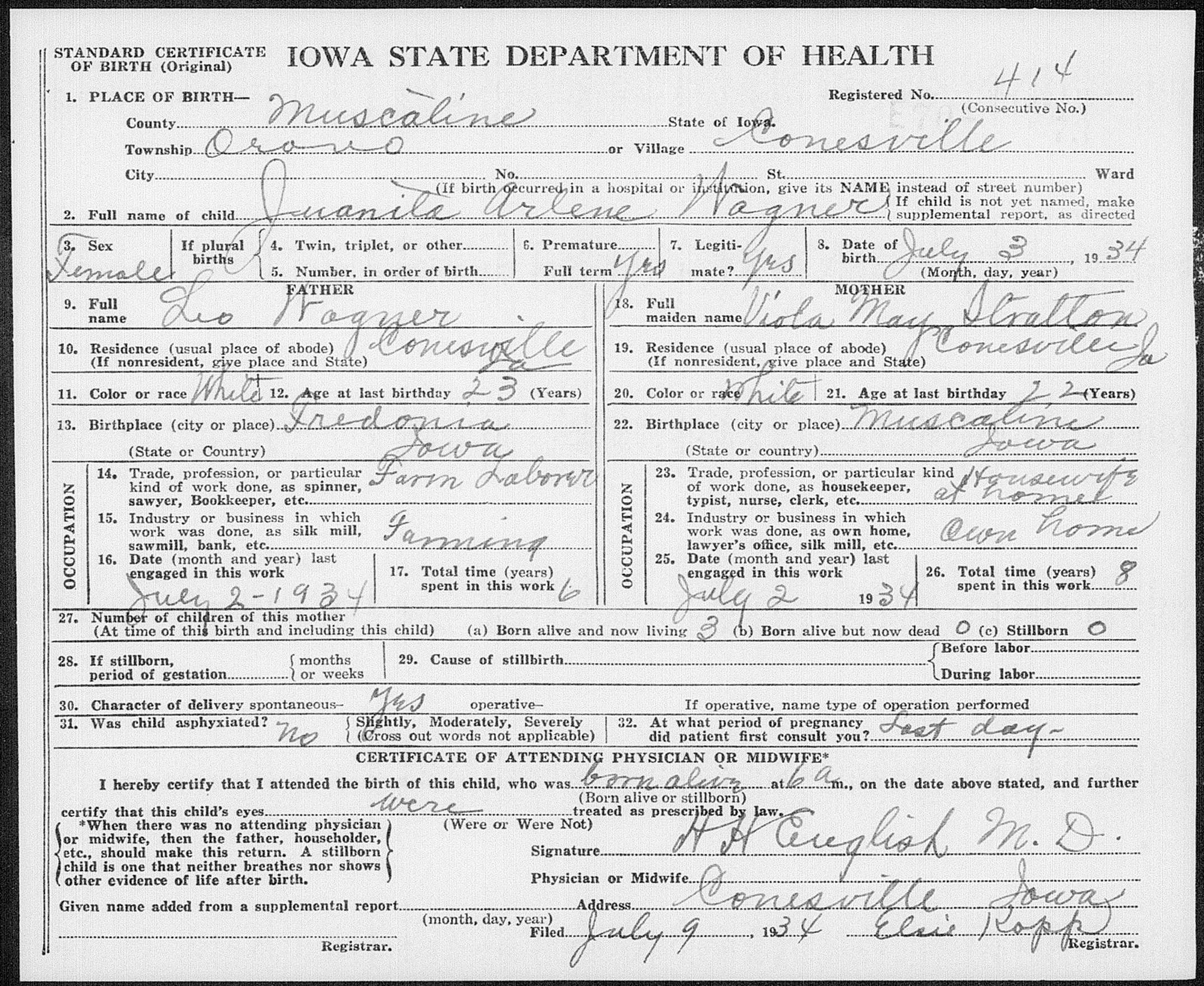 2 "Iowa, Birth Records, 1921-1942," database, FamilySearch (https://www.familysearch.org/search/collection/2849548 : accessed 27 Jul 2019), entry for Juanita Arlene Wagner, 3 Jul 1934; citing Birth, Conesville, Muscatine, Iowa, United States, State Historical Society of Iowa, Des Moines.