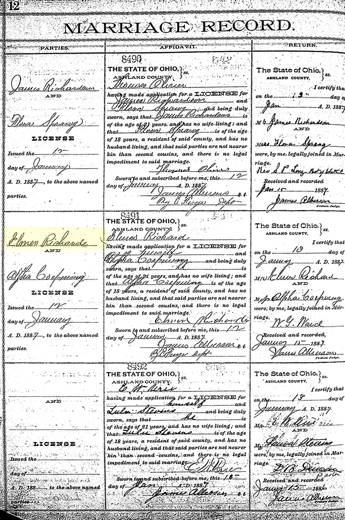 1 "Ohio, County Marriages, 1789-2016," database with images, FamilySearch.org (accessed 3 June 2021); (https://www.familysearch.org/ark:/61903/1:1:ZZ58-2L2M : 8 March 2021), Elmer Richards and Alpha Corpining, 1887.