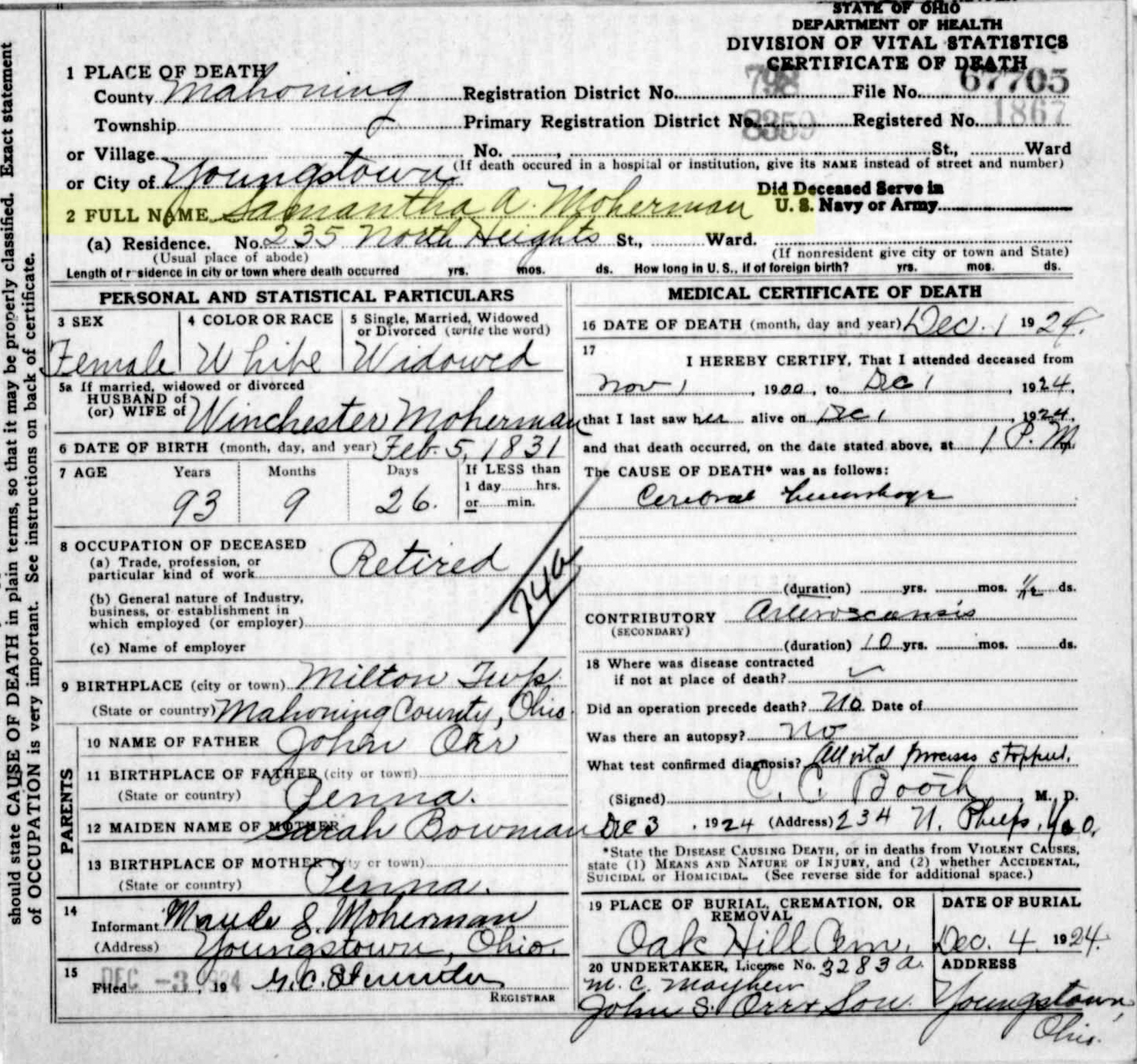 9 "Ohio Deaths, 1908-1953," database with images, FamilySearch.org (accessed 5 April 2021), (https://www.familysearch.org/ark:/61903/1:1:X6SC-HJ6 : 8 March 2021), Samantha A Moherman, 01 Dec 1924; citing Youngstown, Mahoning, Ohio, reference fn 67705; FHL microfilm 1,992,610.