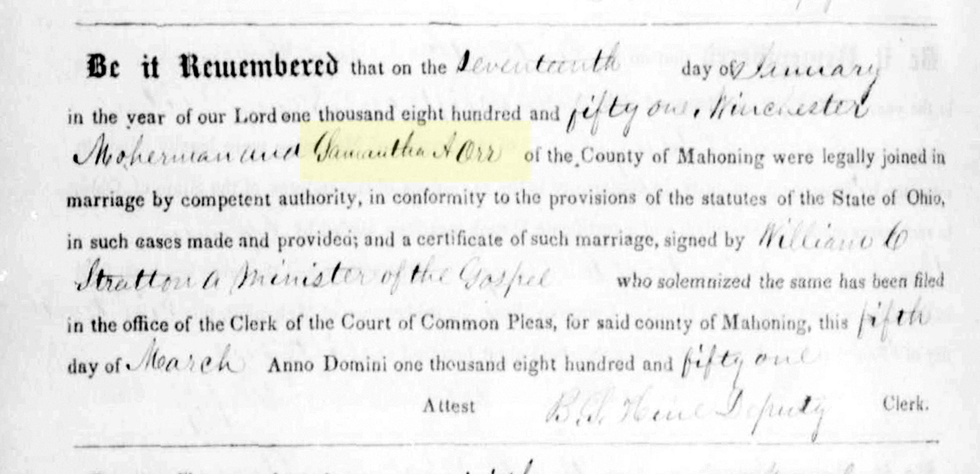 1 "Ohio, County Marriages, 1789-2016," database with images, FamilySearch.org (accessed 4 April 2021); (https://www.familysearch.org/ark:/61903/1:1:XZLH-HDQ : 8 March 2021), Winchester Noherman and Samantha A. Orr, 17 Jan 1851; citing Marriage, Mahoning, Ohio, United States, P184, Franklin County Genealogical & Historical Society, Columbus; FHL microfilm.