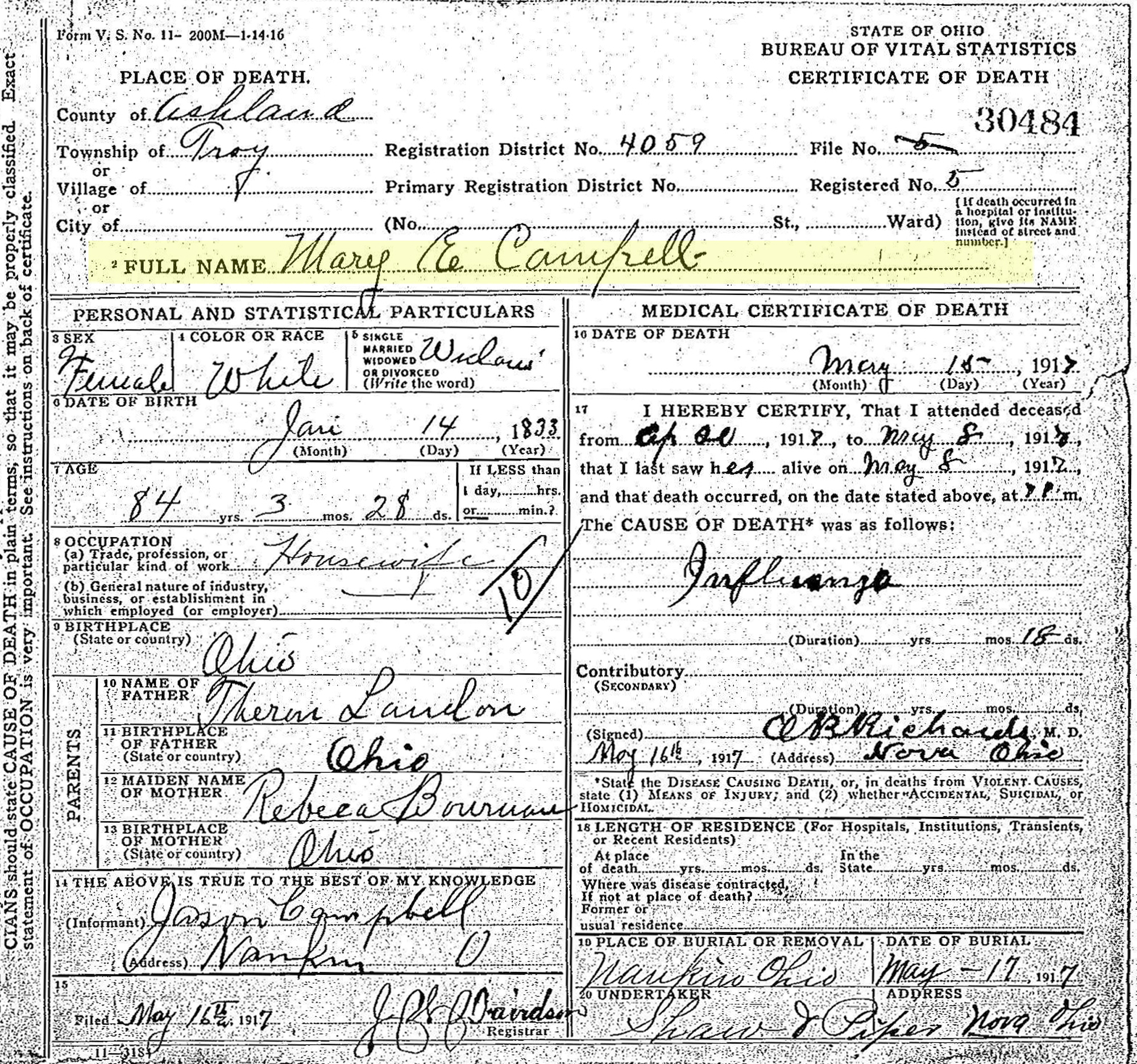 6 "Ohio Deaths, 1908-1953," database with images, FamilySearch.org (accessed 29 April 2021), (https://www.familysearch.org/ark:/61903/1:1:X8J3-786 : 29 April 2021), Mary E Campell, 15 May 1917; citing Troy, Ashland, Ohio, reference fn 30484; FHL microfilm 1,984,012.
