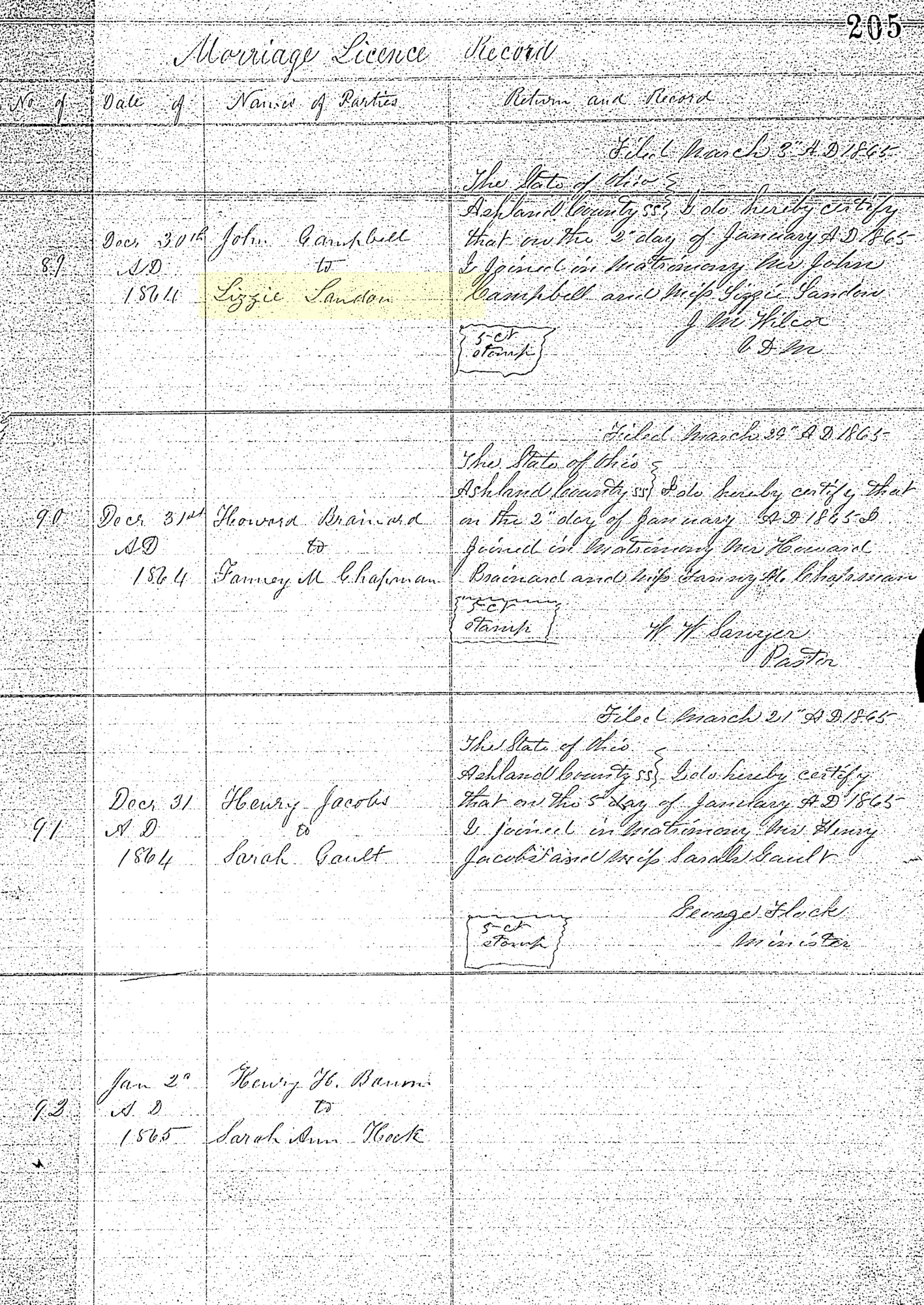 1 "Ohio, County Marriages, 1789-2016," database with images, FamilySearch.org (accessed 29 April 2021); (https://familysearch.org/ark:/61903/1:1:XZHH-S9N : 8 March 2021), John Campbell and Lizzie Landon, 02 Jan 1865; citing Marriage, Ashland, Ohio, United States, v 3 p 205 no. 89, Franklin County Genealogical & Historical Society, Columbus; FHL microfilm.