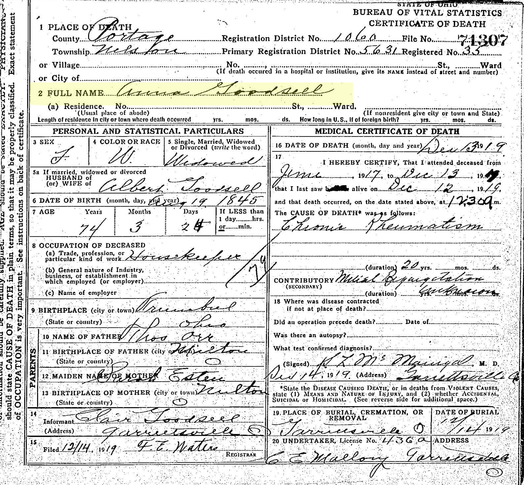 7 "Ohio Deaths, 1908-1953," database with images, FamilySearch.org (accessed 21 March 2021), (https://familysearch.org/ark:/61903/1:1:X82P-YMK : 8 March 2021), Anna Goodsell, 13 Dec 1919; citing Nelson, Portage, Ohio, reference fn 71307; FHL microfilm 1,984,986.
