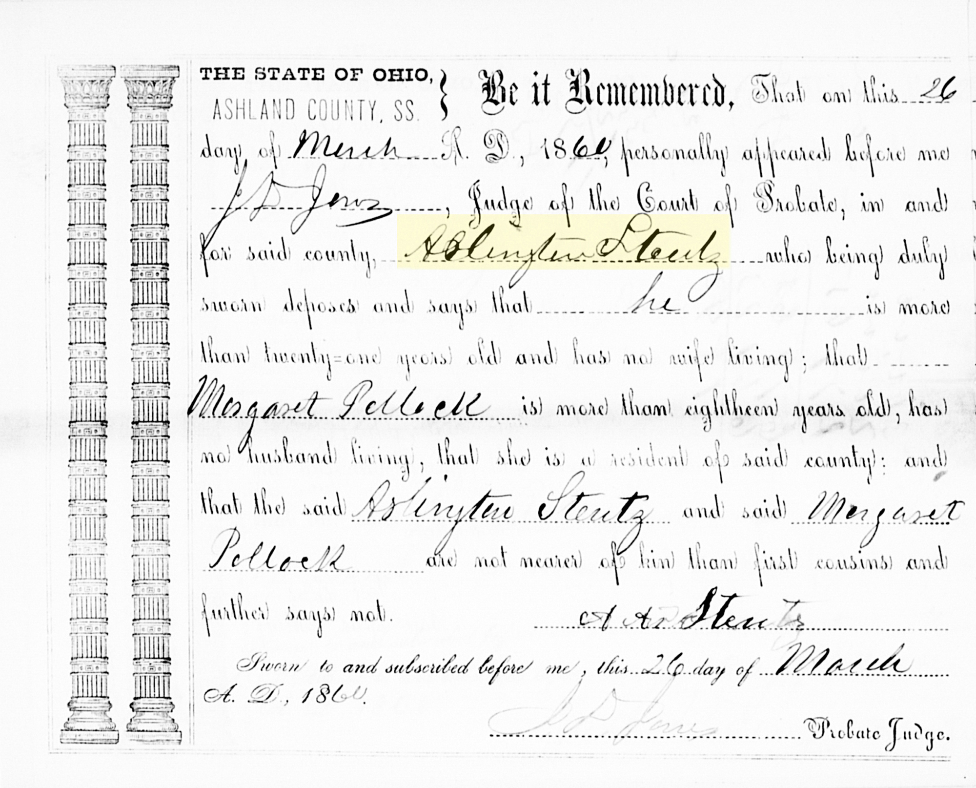 1 "Ohio, County Marriages, 1789-2016," database with images, FamilySearch.org (accessed 3 March 2021); (https://familysearch.org/ark:/61903/1:1:X8QX-HH3 : 26 August 2019), Arlington Stentz and Margaret Pollock, 26 Mar 1860; citing Marriage, Ashland, Ohio, United States, Franklin County Genealogical & Historical Society, Columbus; FHL microfilm.