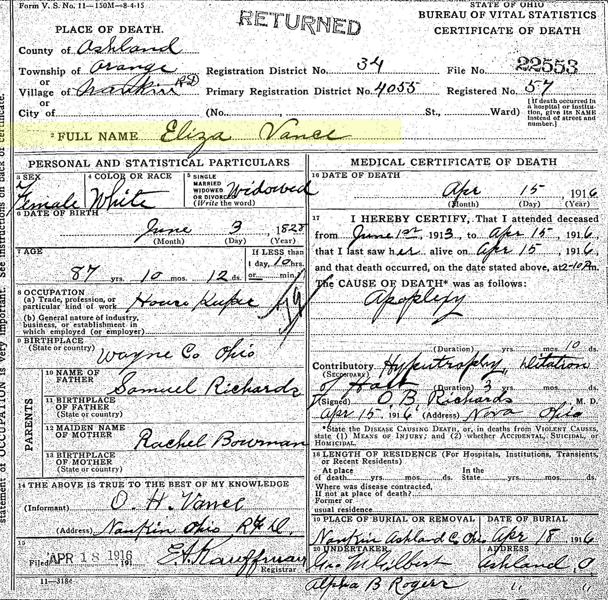 7 "Ohio Deaths, 1908-1953," database with images, FamilySearch.org (accessed 29 May 2021), (https://www.familysearch.org/ark:/61903/1:1:X8NQ-FZN : 29 May 2021), Eliza Vance, 15 Apr 1916; citing Orange Twp., Ashland, Ohio, reference fn 22553; FHL microfilm 1,983,647.