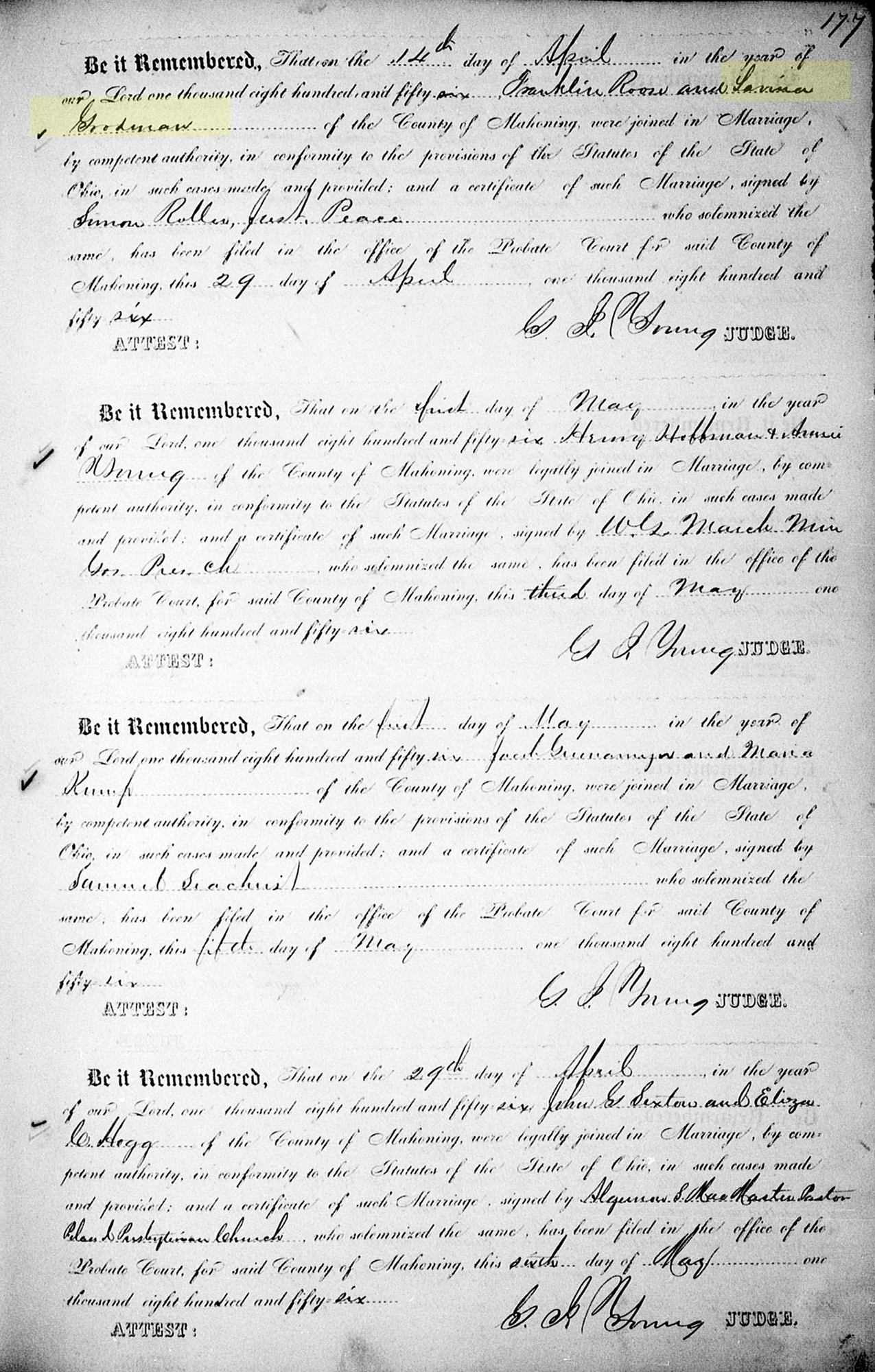 1 "Ohio, County Marriages, 1789-2016," database with images, FamilySearch.org (accessed 26 May 2021); (https://familysearch.org/ark:/61903/1:1:X8H8-SMB : 8 March 2021), Franklin Roose and Lavina Goodman, 14 Apr 1856; citing Marriage, Mahoning, Ohio, United States, 177, Franklin County Genealogical & Historical Society, Columbus; FHL microfilm.