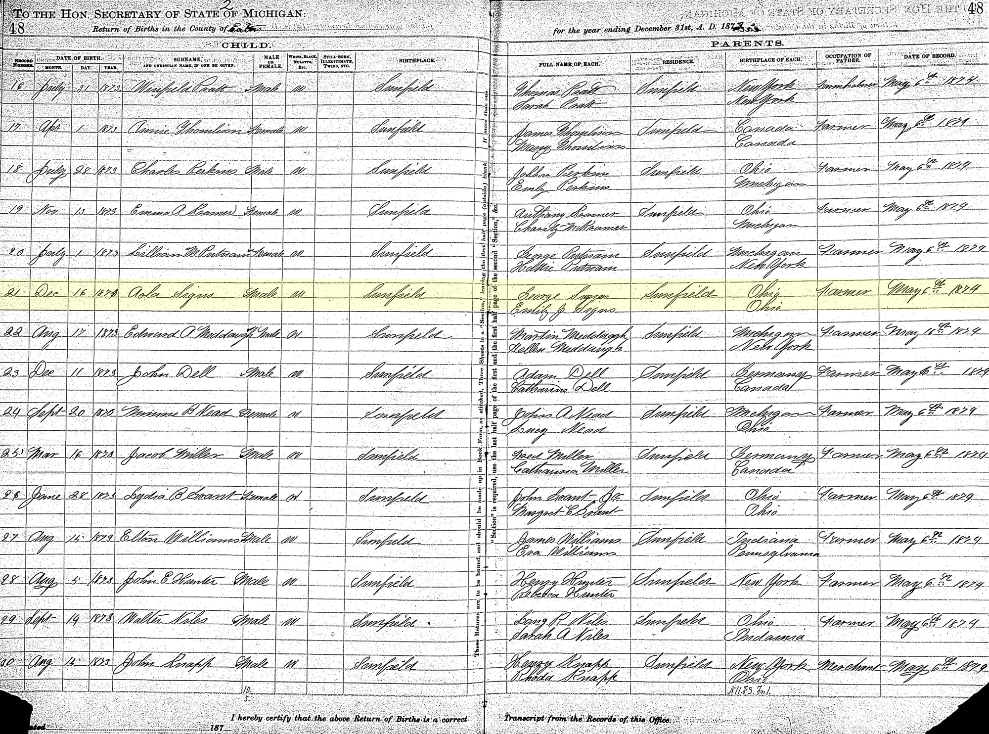 6 "Michigan Births, 1867-1902," database with images, FamilySearch.org (accessed 24 June 2021); (https://familysearch.org/ark:/61903/1:1:NQC9-MZR : 20 February 2021), Aola Signs; citing, Sunfield, Eaton, Michigan, Department of Vital Records, Lansing; FHL microfilm .